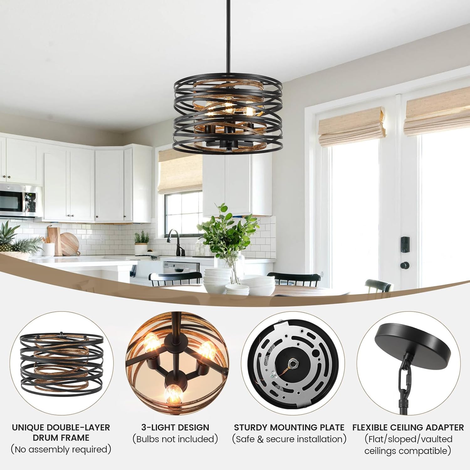 - 【Modern Farmhouse Chandelier】The chandelier features a unique double-layer drum frame design that perfectly blends modern and farmhouse aesthetics. The clever combination of the outer black and inner wood grain lines not only enhances the visual layering but also allows the light to cast enchanting shadow effects through the frame, instantly elevating the comfort and style of the space. Whether placed in the dining room, living room, entrance, hallway, foyer, or bedroom, the black chandelier serves as a striking focal point.