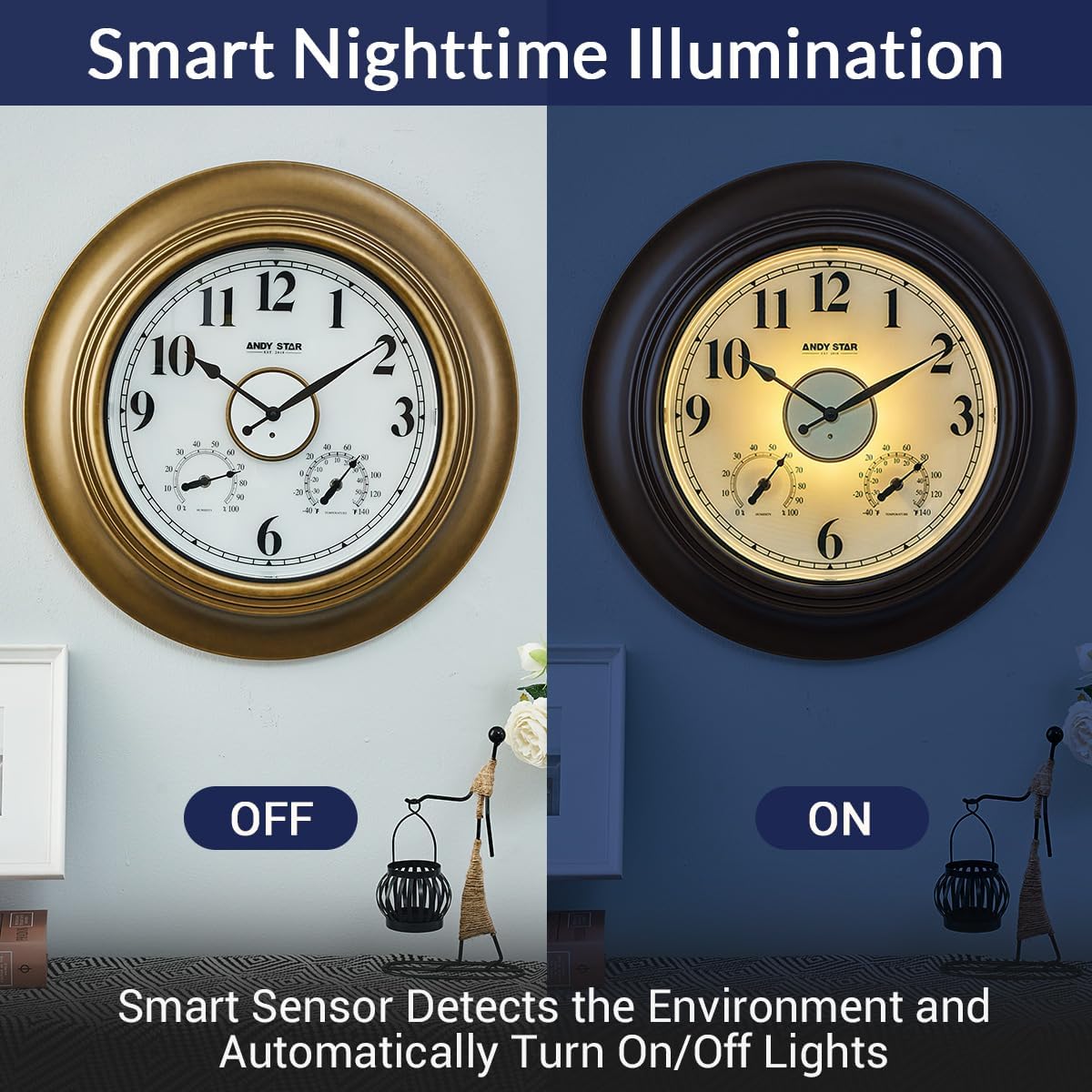 - Smart Light Sensor Technology: This 21 inch outdoor clock with temperature automatically illuminates with a warm backlight in the dark. It's easy to read from afar even then; The smart sensor lights up a warm glow at night and turns off in daylight;Select from Always On, Off, or 4 - hour timer backlight modes
