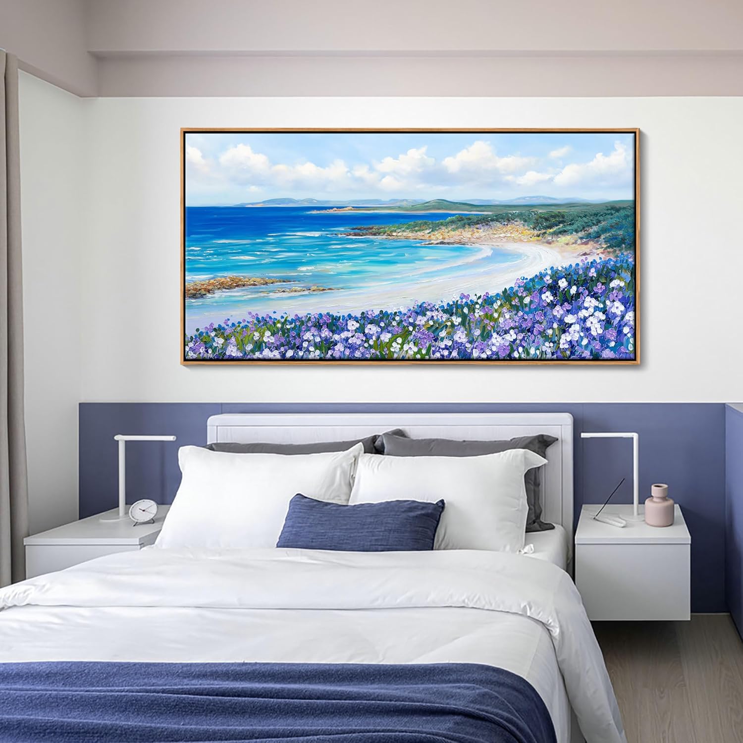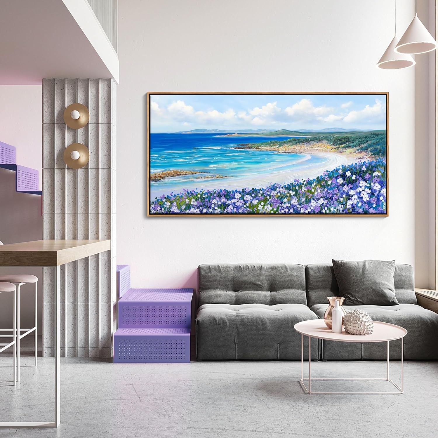 - Beautiful Coastal Vibes: This coastal beach wall art brings serene ocean views and purple flowers into your living room or bedroom, creating a calming atmosphere.