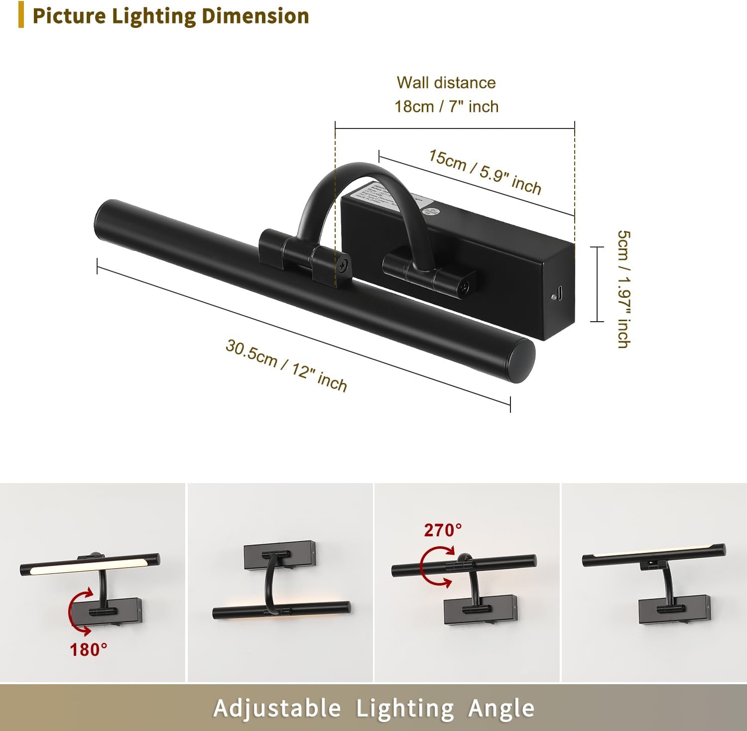 - Adjustable Light Direction: The lamp head can be 270° rotatable, combined with 180° spinning swing arm, the picture frame light disperses the light wherever you want, it's a perfect lighting solution for your artwork or family portrait wall.