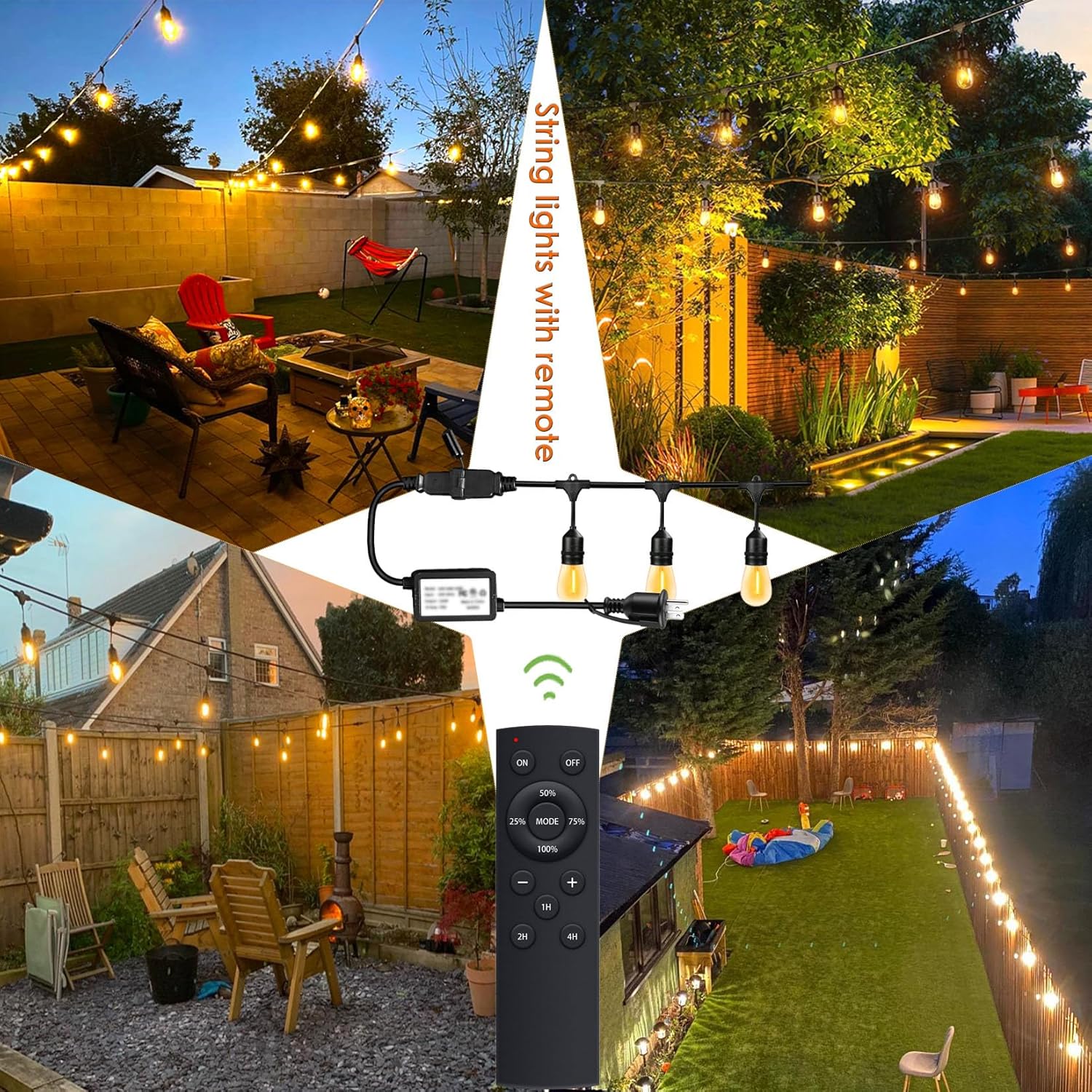 - Patio string lights with RF remote:With the included remote, you can easily set the mood by dimming the lights, toggling between 3 enchanting lighting modes, and setting a timer—all without leaving your cozy chair. Transform any gathering into a magical experience in an instant.