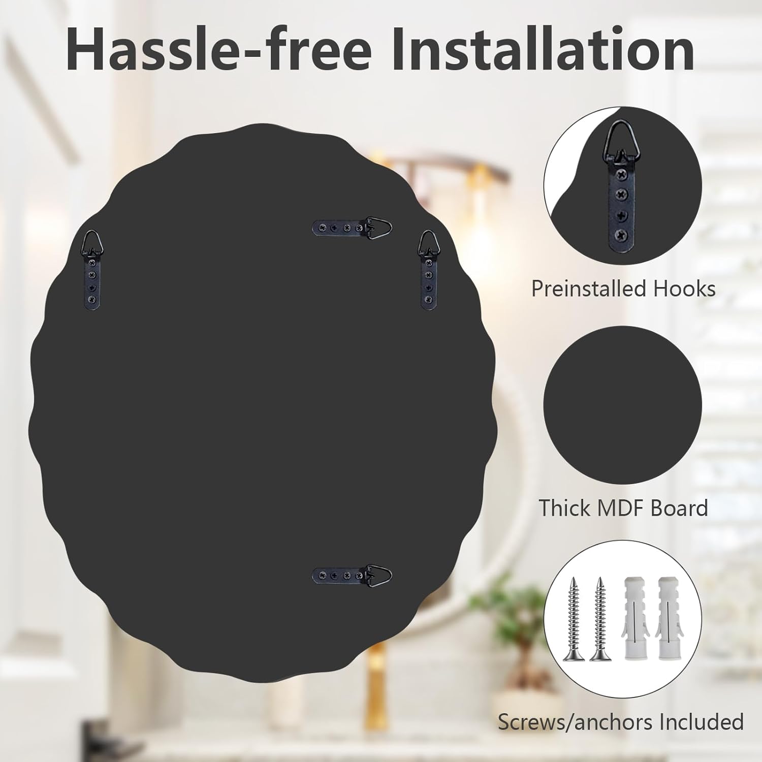 - Easy Installation: All mounting hardware are included. The thick MDF backboard is sturdy enough to support the weight of this oval bathroom mirror, with 4 pre-installed hooks on it, you can easily complete the installation within minutes. Support for both horizontal and vertical hanging.