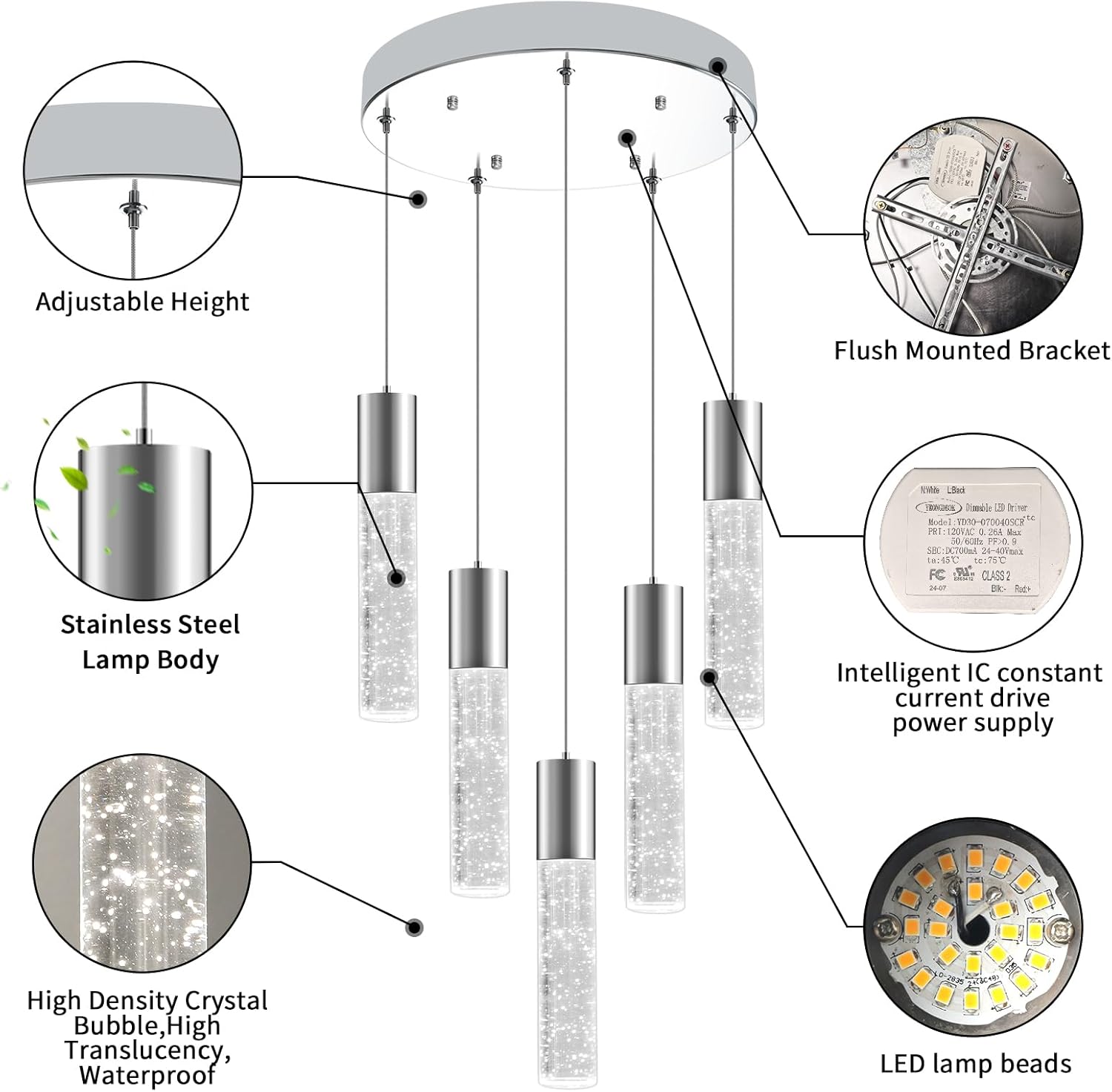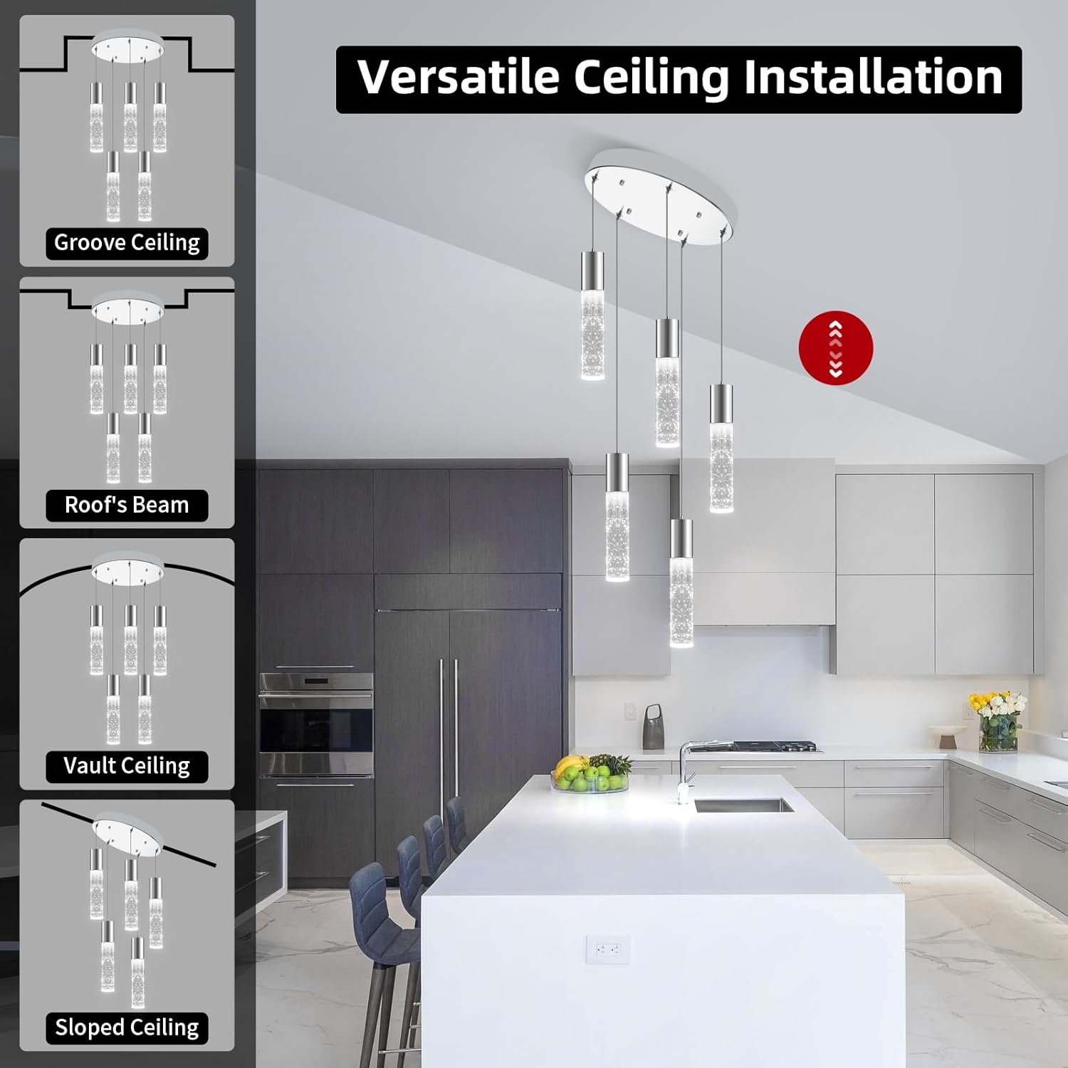 - 【Sleek & Modern Design】Elevate your space with this modern pendant light, featuring electro-chrome steel accents and cylindrical crystal bubble detailing. Designed to infuse luxury and artistry into your home, it transforms your kitchen island into a sophisticated focal point.