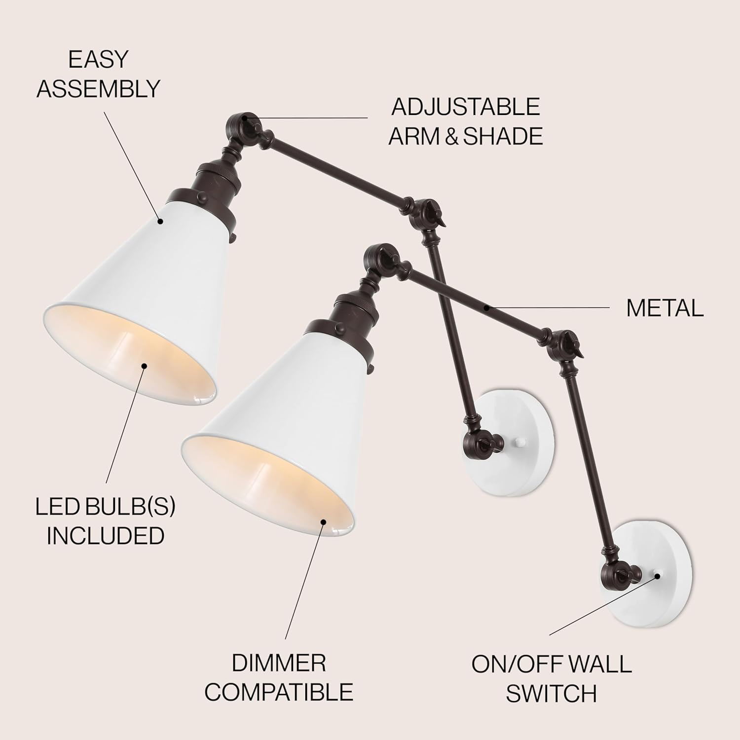 JONATHAN Y JYL7462C-SET2 Rover 7" Classic Industrial Metal Adjustable Arm LED Wall Sconce, White/Oil Rubbed Bronze (Set of 2) for Bedroom, Bathroom, Vanity