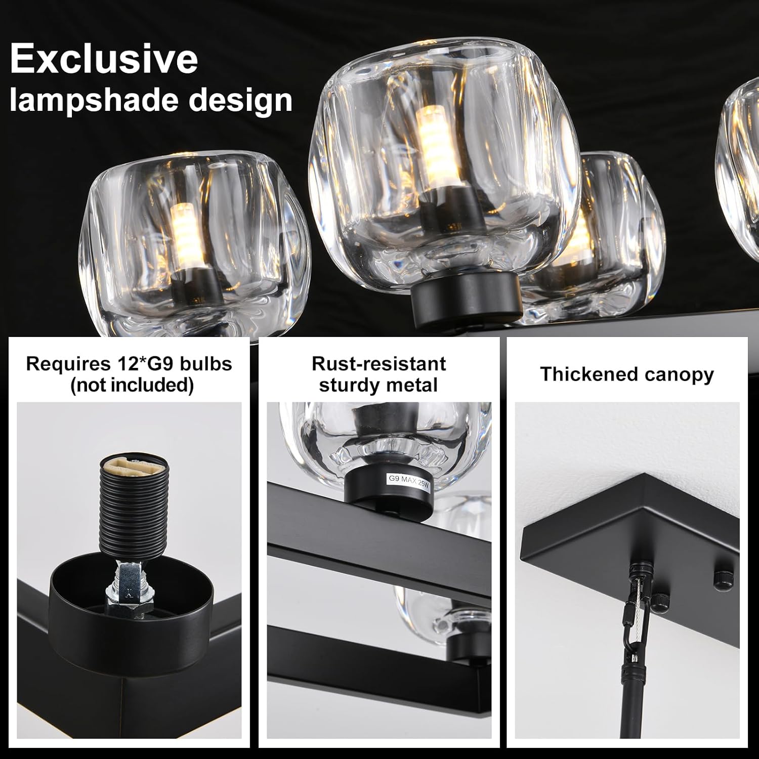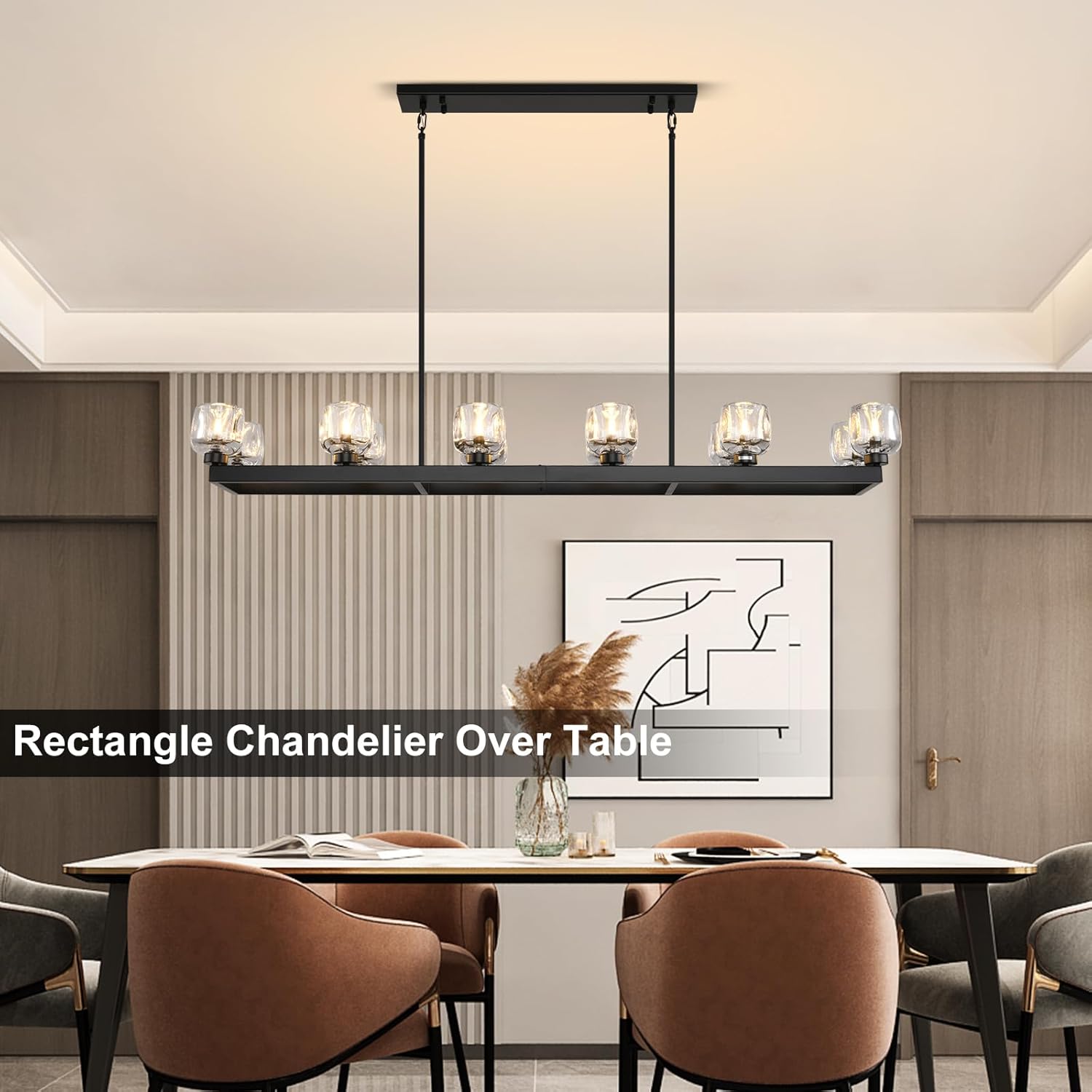 - 【12-Light Chandelier】Black rectangle chandelier offers 360° light coverage to brighten your space & create a cozy vibe. The linear chandelier for dining room requires 12 G9 bulbs and available for infinite dimming via a dimmer. (Dimmable bulbs & dimmer not included).