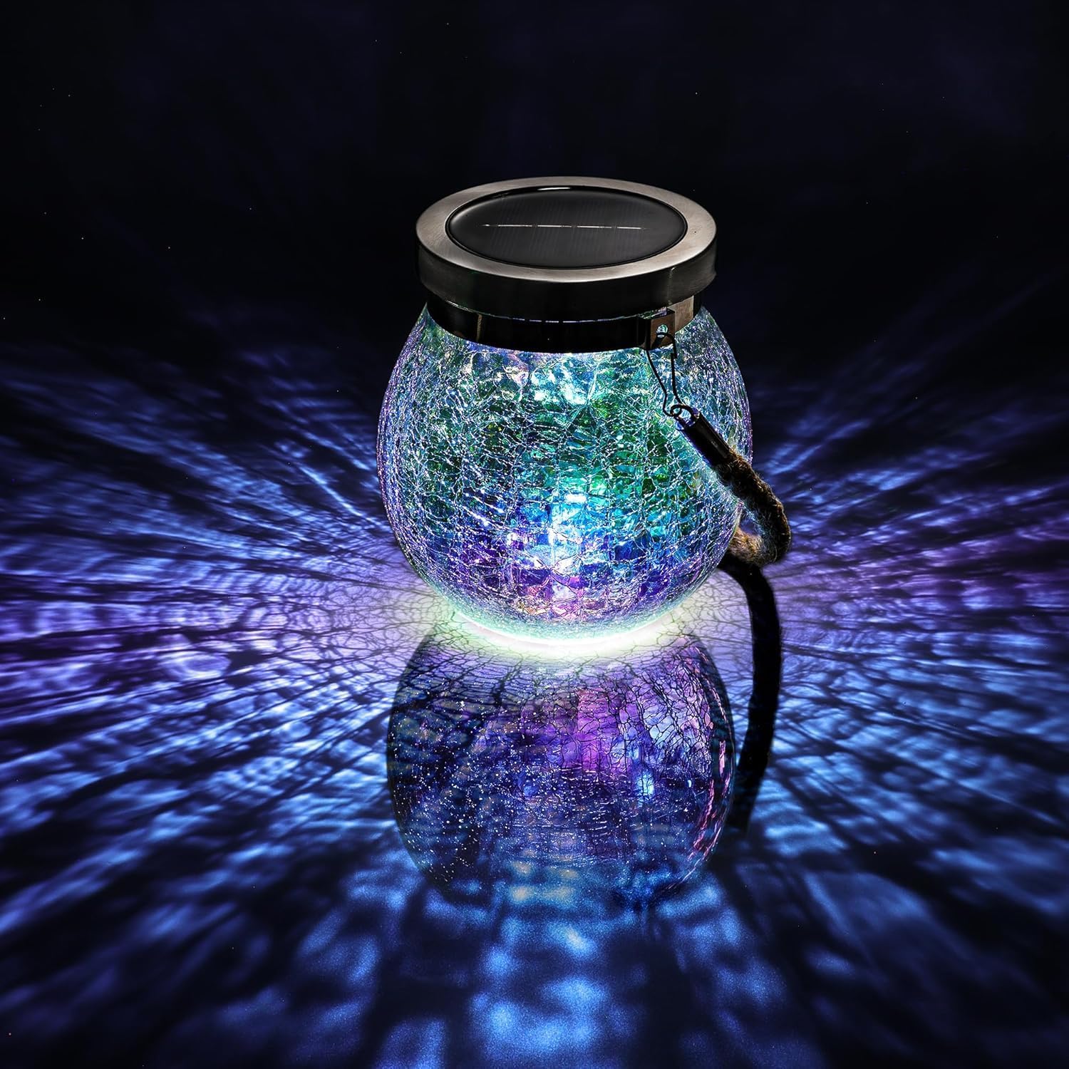 - 《 Built Solid, Hangs Strong—Now in Iridescent Glass》This isn’t just thick crackle glass—it’s electroplated with a color-shifting rainbow finish that dazzles from every angle in daylight. The round body sits securely on flat surfaces, while the stainless steel collar and durable jute rope let it hang with confidence. Heavy in hand, radiant in light, and designed to captivate—day or night.