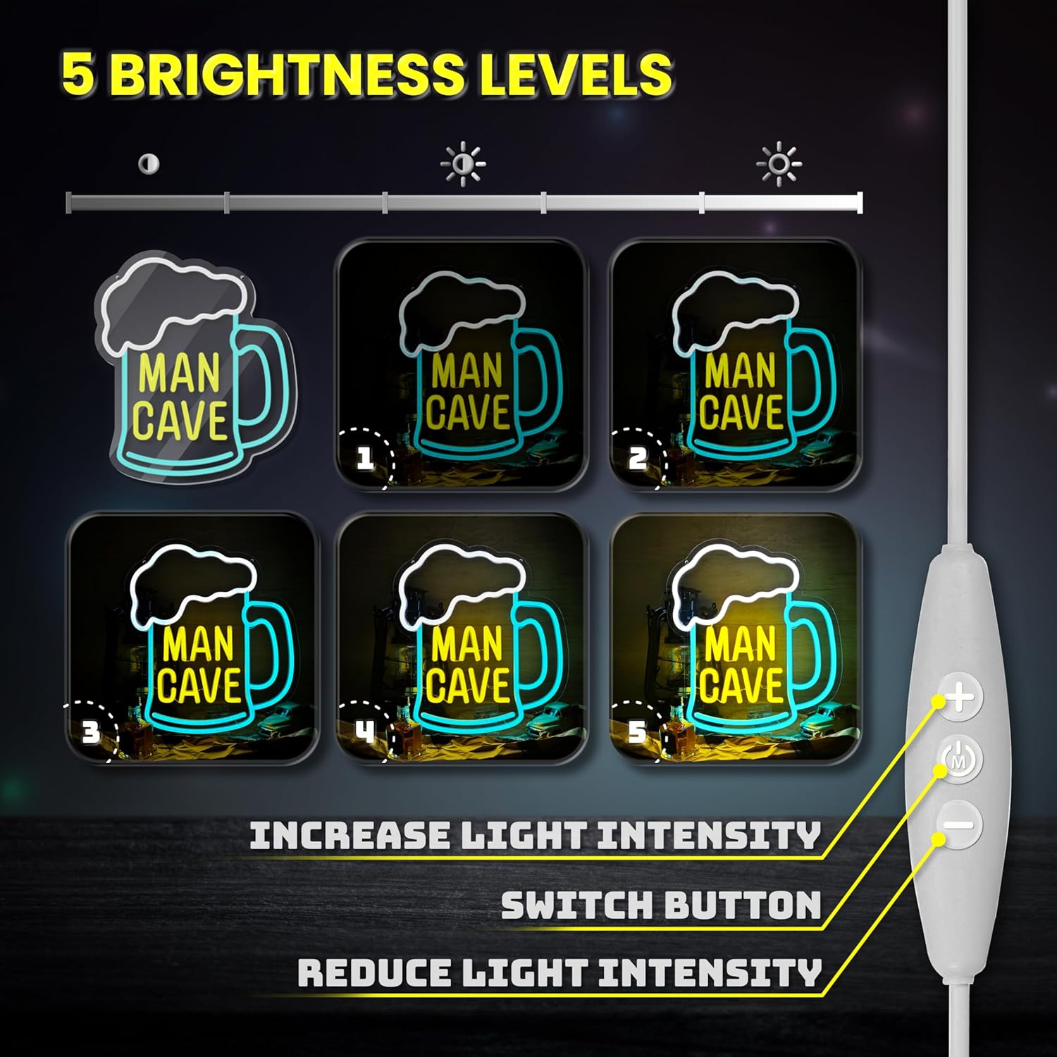 - 【Dimmable】 Man Cave neon sign has 3 smart buttons that can adjust the brightness from 10% to 100% to meet your different lighting needs. After you adjust the brightness, turn it off, and when you turn it on again, the neon sign light will still be the brightness you adjusted, without you having to adjust it again.