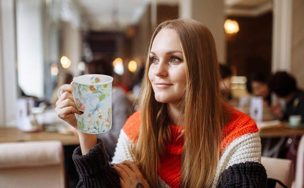 Lightahead Elegant Bone China Two Coffee Mugs Set in Floral Design 10.8 oz Each Cup in Attractive Gift Box