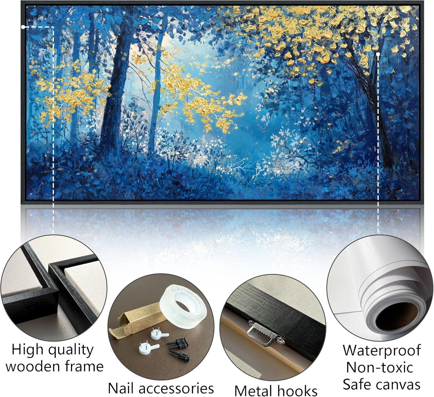 - Blue and Gold Canvas Wall Art Size:This 20×40 inches canvas wall art features a serene forest landscape with trees, blending blue and gold tones to create a modern yet timeless look for your living room, bedroom, or office.