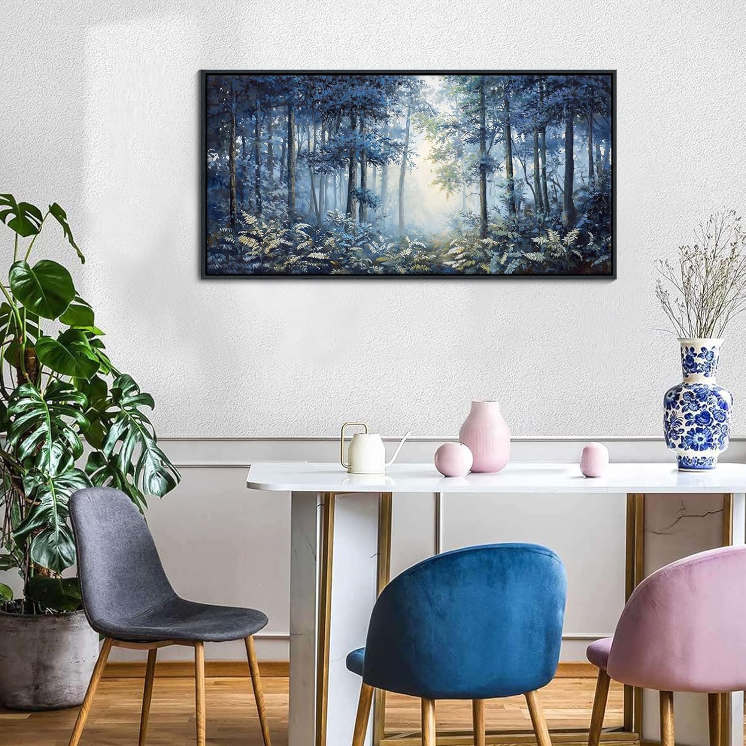 - Navy Blue Canvas Wall Art Size: This 20×40 inches canvas wall art features a serene forest landscape in navy blue and lush green tones, perfect for adding calm and elegance to your living room, bedroom, or office.
