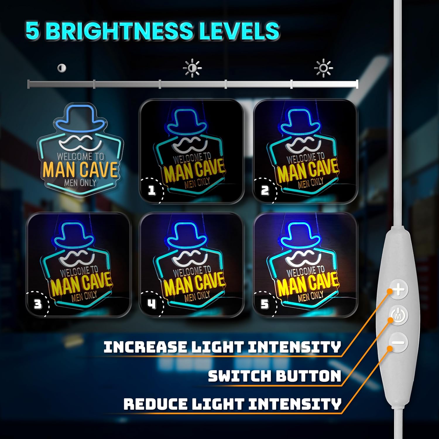 - 【Dimmable】 Man Cave neon sign has 3 smart buttons that can adjust the brightness from 10% to 100% to meet your different lighting needs. After you adjust the brightness, turn it off, and when you turn it on again, the neon sign light will still be the brightness you adjusted, without you having to adjust it again.