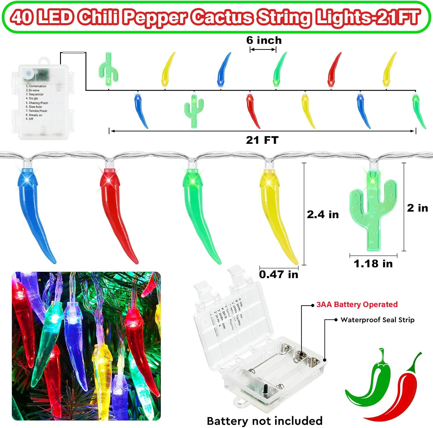 - 🌵 Timer & 8 Light Modes: These multi-color chili pepper lights feature 8 lighting modes (Combination, Wave, Sequence, Slow Flash, Chasing/Flash, Slow Fade, Twinkle/Flash, Steady On) to meet all your summer decorating needs.Timer Automatically turns On for 8 hours and then powers Off for 16 hours ,You'll never have to worry about forget to turn off the lights.