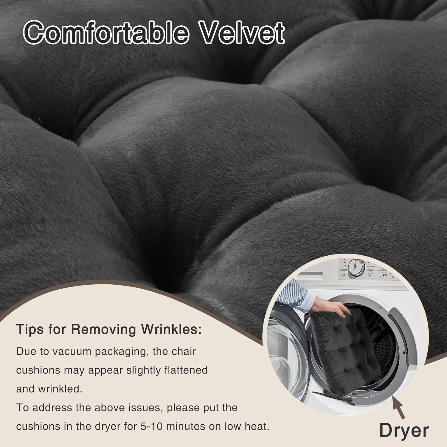 - Tips for Care: Due to the large volume of the tufted chair cushions, it is packed in a vacuum bag to prevent damp and dust.If you find that it is slightly flat or a little creased after opening, it can be restored to its soft shape by leaving it to stand for 24-48 hours, then placing it in the tumble dryer on a low heat for 10 minutes.If it does need to be cleaned, please use a neutral detergent.