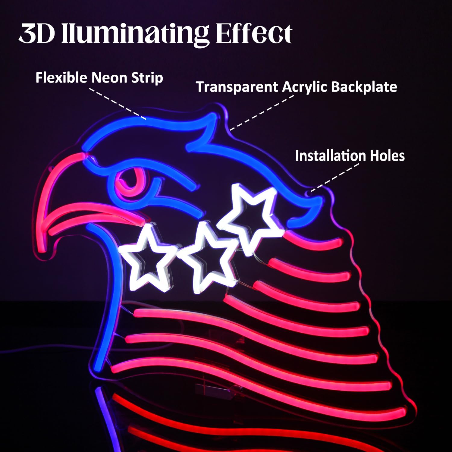 - 【Eagle Flag Neon Sign】 This patriotic decoration neon wall light has a unique design, with bald eagle, Stars and Stripes. Light up the USA flag neon LED sign to add vibrant colors to your room. The eagle neon sign is for long-term use, low energy consumption, no flicker, no heat.