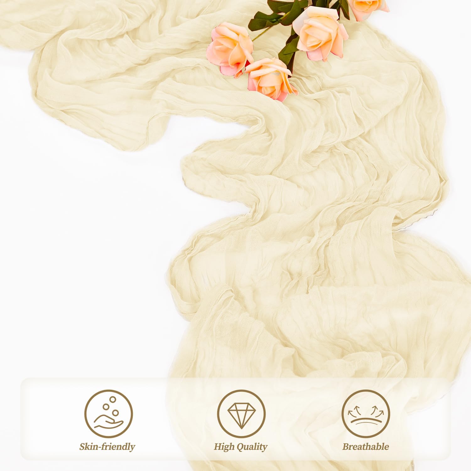 - Elegant Design: This cheese cloth runner is a perfect decorative element for dining tables and parties. Its pleated design makes it very elegant and romantic, flowing naturally on the table like water, making the dining table for weddings and parties look very beautiful. It can be paired with flowers and candlesticks, or tied with a bow to create various romantic feelings.