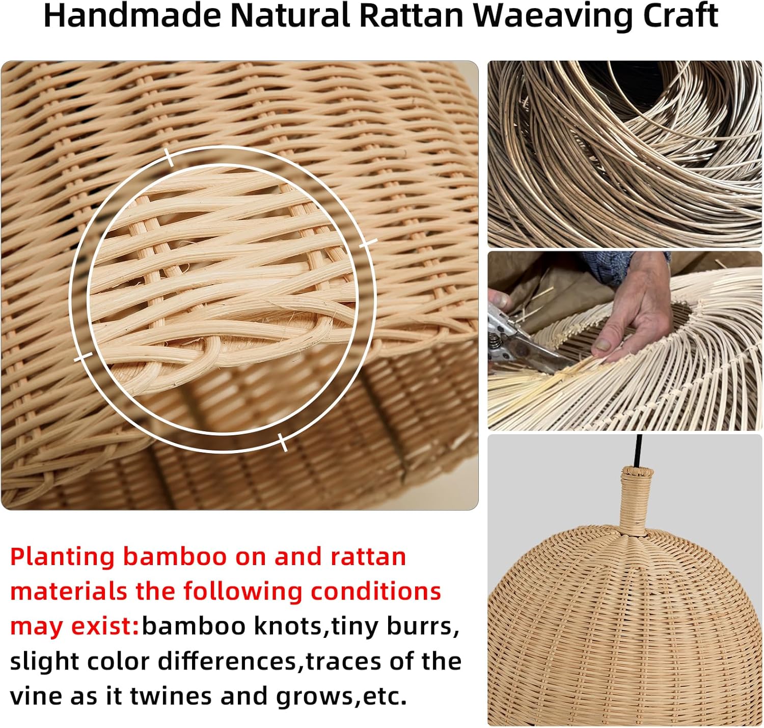 - Notes 1. Natural Materials Our products are made of high-quality bamboo, rattan, and straw rope Since these materials are natural materials, the following conditions may exist: bamboo knots, tiny burrs, slight color differences, micro scars, etc During the use of lamps, the color will change slightly over time, which is a natural change