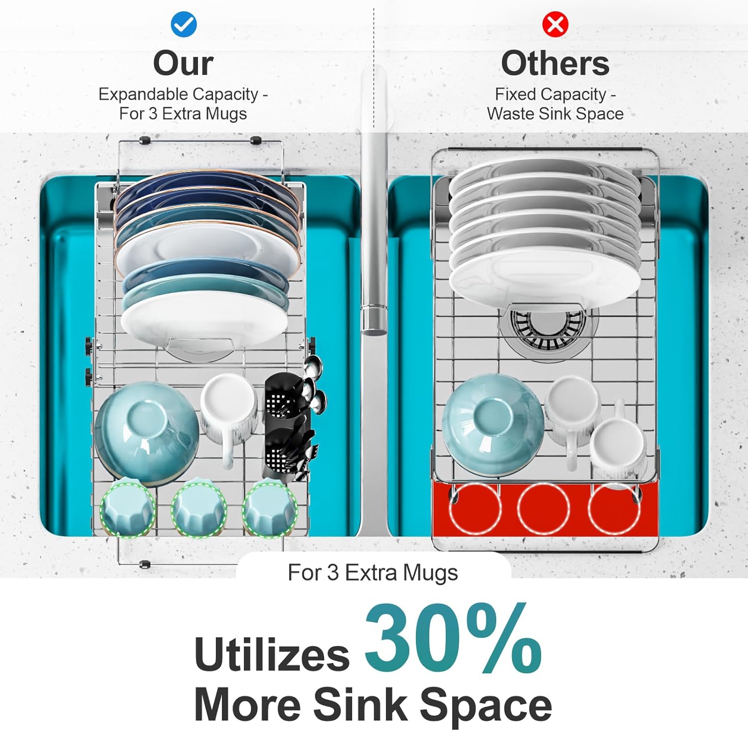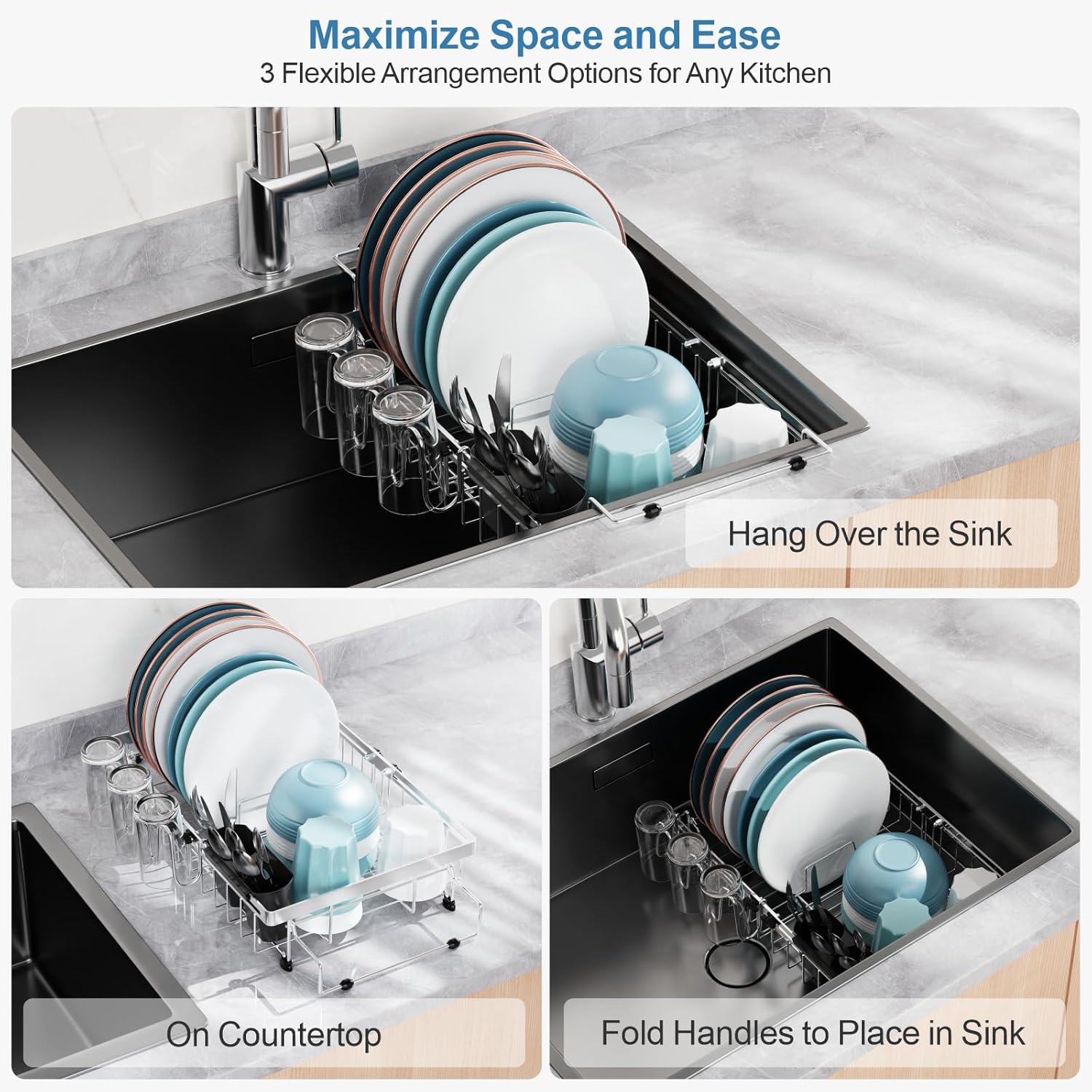 - True Expandable, Real Capacity Boost: Unlike other racks that only extend handles, our dish drainer expands as a whole unit—truly increasing your drying space, allowing you to comfortably hold at least 3 extra cups in addition to 6 plates, bowls, utensils, and even fresh fruits and veggies. This innovative design not only ensures perfect sink compatibility but genuinely maximizes your drying area