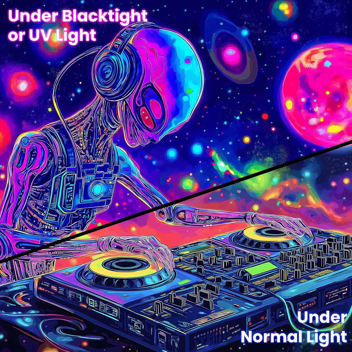BVBOX Blacklight Space Alien Tapestry 79"x59", UV Reactive Glow in Dark DJ Alien Universe Galaxy Planet Music Tapestries, Black Light Neon Upright Poster Wall Hanging Backdrop Decor for Bedroom Living Room