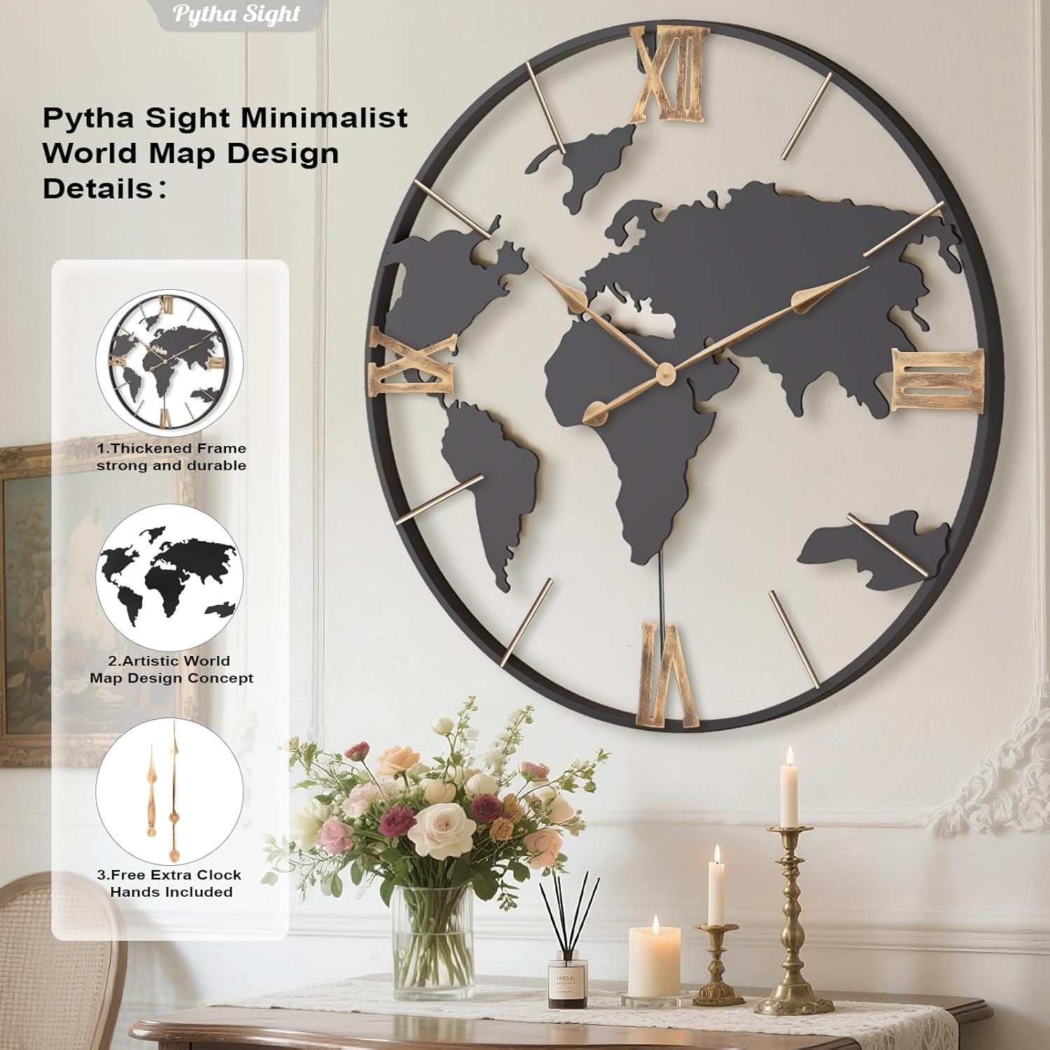- 【Artistic World Map Design Concept】Pytha Sight 36inch large decorative world map wall clock combines the continent structure with a hollow design, outlining the continents with a stylish, minimalist artistic concept. It perfectly showcases the beauty of minimalist art. Not only does it have educational value, but it also displays an exquisite and elegant artistic effect.