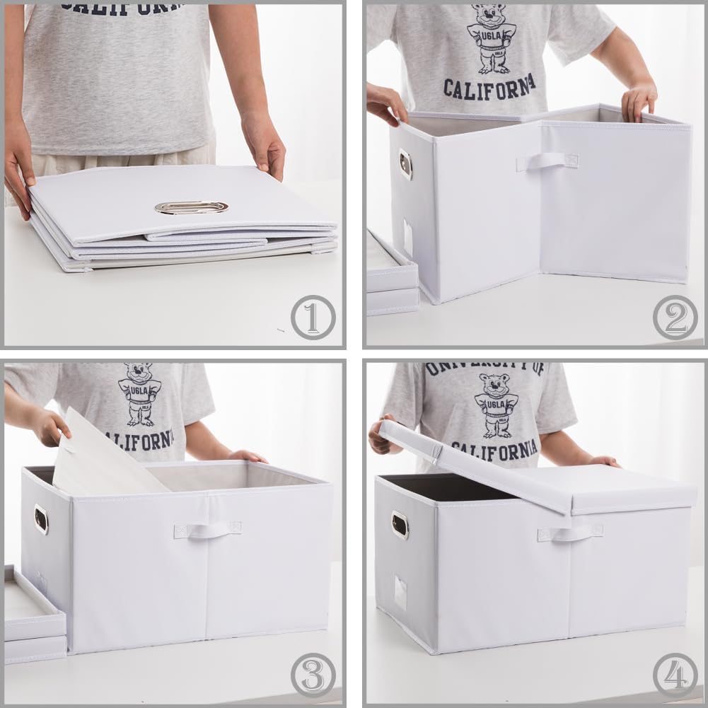 PRANDOM Collapsible Storage Box with Lid [3-Pack] Leather Fabric Foldable Storage Bin Organizer Container Basket Cube with Cover for Home Bedroom Closet Office Nursery White(22.8X15.7X11.8)