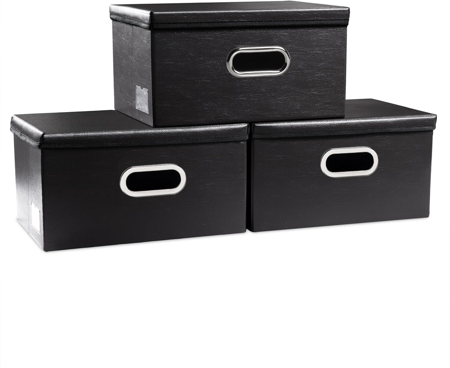 PRANDOM Collapsible Storage Box with Lid [3-Pack] Leather Fabric Foldable Storage Bin Organizer Container Basket Cube with Cover for Home Bedroom Closet Office Nursery Black(13.6x9.6x6.9)