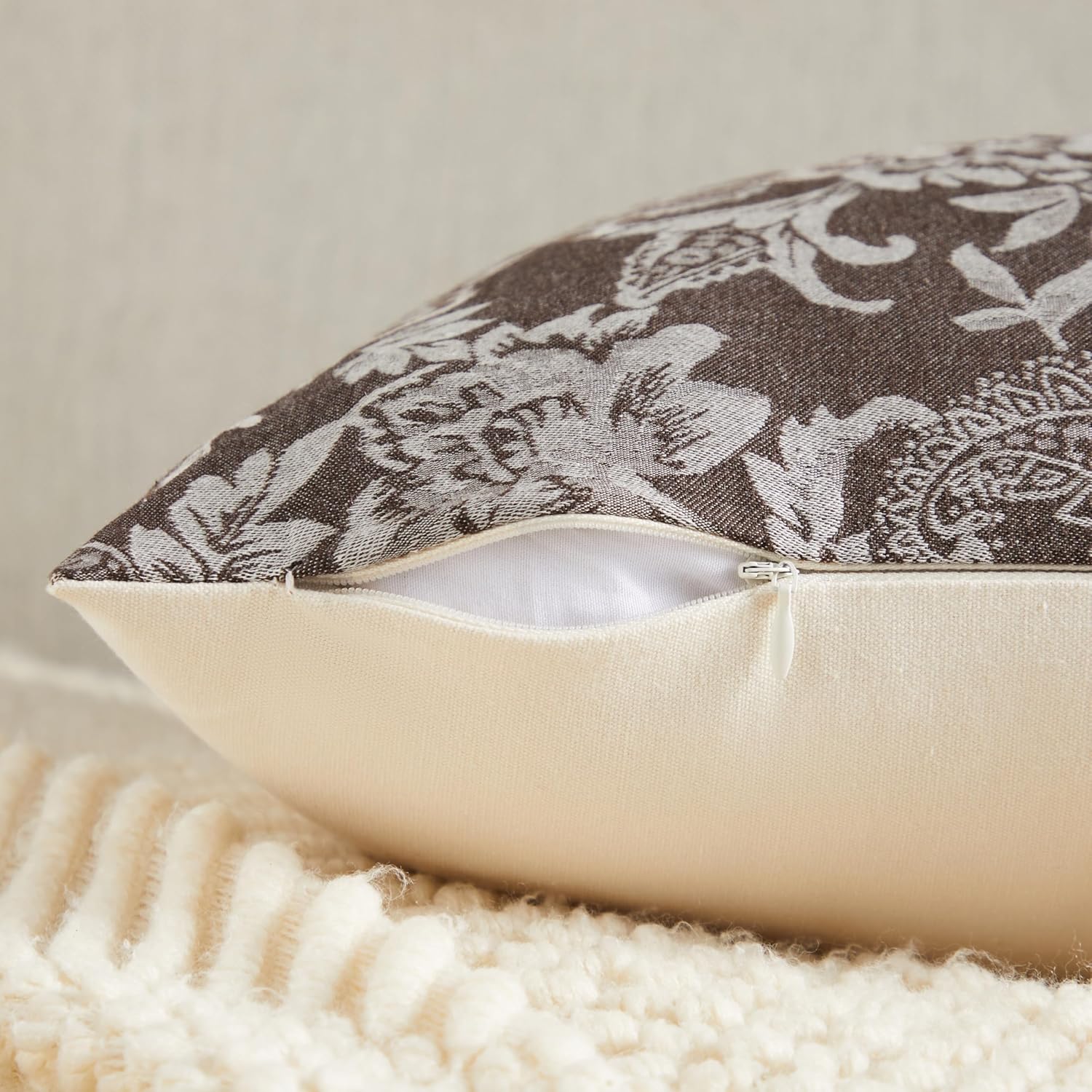 Floral Jacquard Throw Pillow Covers Set of 2, Background/Chocolate 24x24 Inch, Farmhouse Decorative Cotton Dark Brown Cushion Covers for Sofa Bed Living Room Home Decor