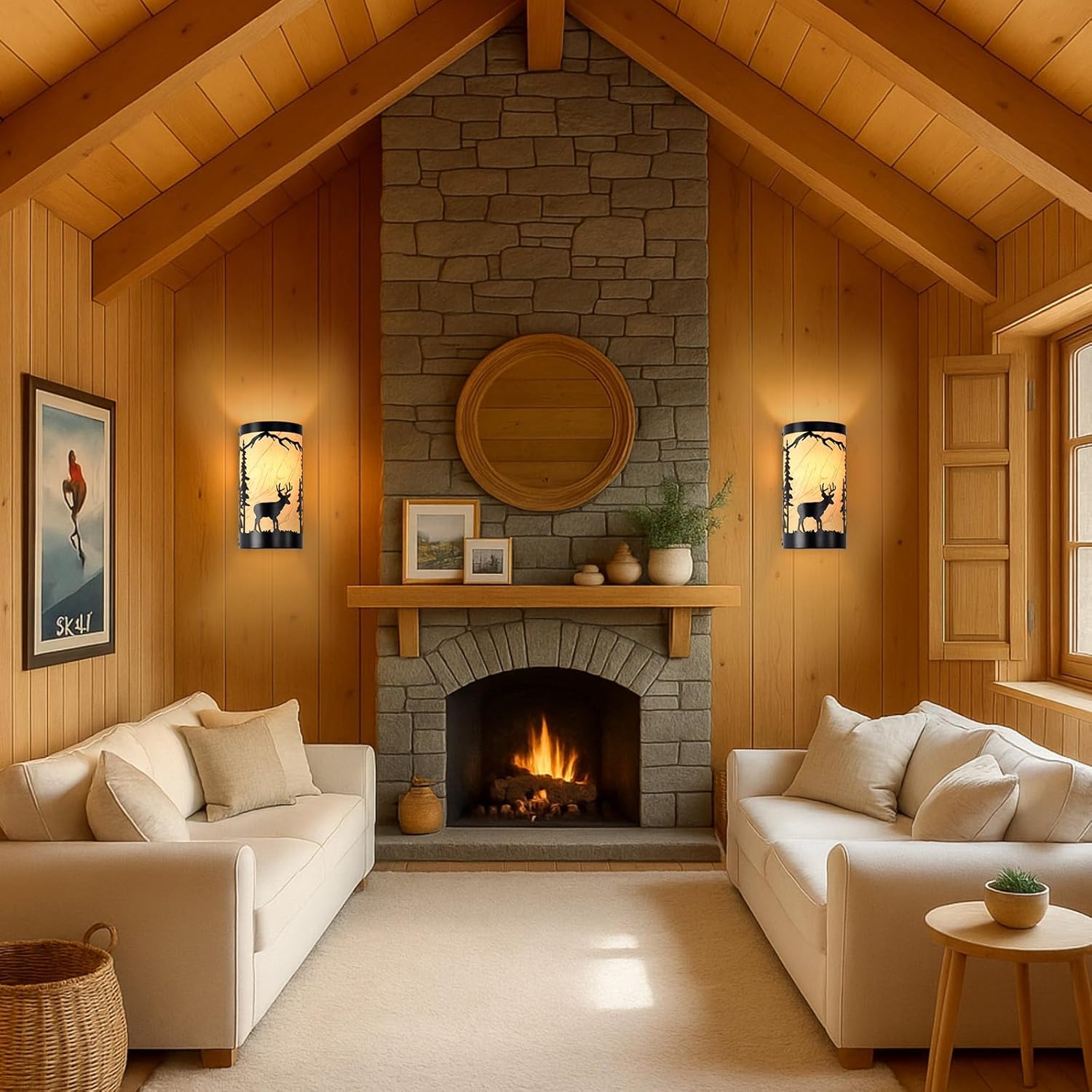 - Rustic Design: Farmhouse wall sconce is crafted from durable matte black metal,featuring intricate forest elements and a deer silhouette,yellow parchment paper adds a soft,warm glow,enhancing industrial aesthetic of the black wall sconce