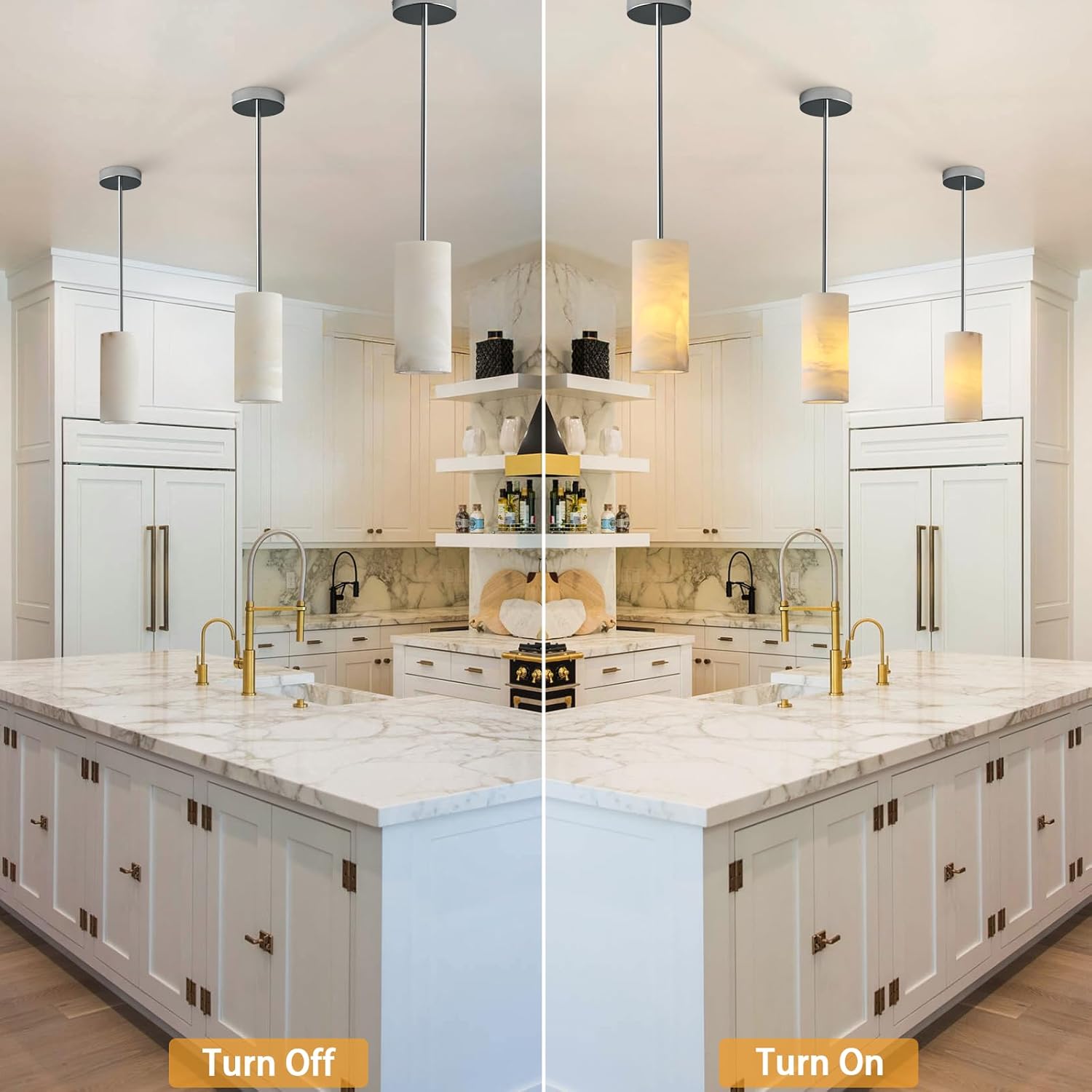 • 【Height Adjustable & Brightness】The alabaster pendant light is H 10‘’ , Φ 4'', Weight: 11.8lb. Installation with 6 connecting rods: 5.91'' 2pcs, 11.8'' 2pcs, 17.7'' 2pcs with a maximum length of 71'' (180cm). You can DIY the chandelier to your preferred height as needed. Compatible with 90% of dimmer switches on the market, freely adjust 10%-100% brightness, allowing you to customize your lighting atmosphere for any mood or occasion. (DIMMER NO INCLUDED).