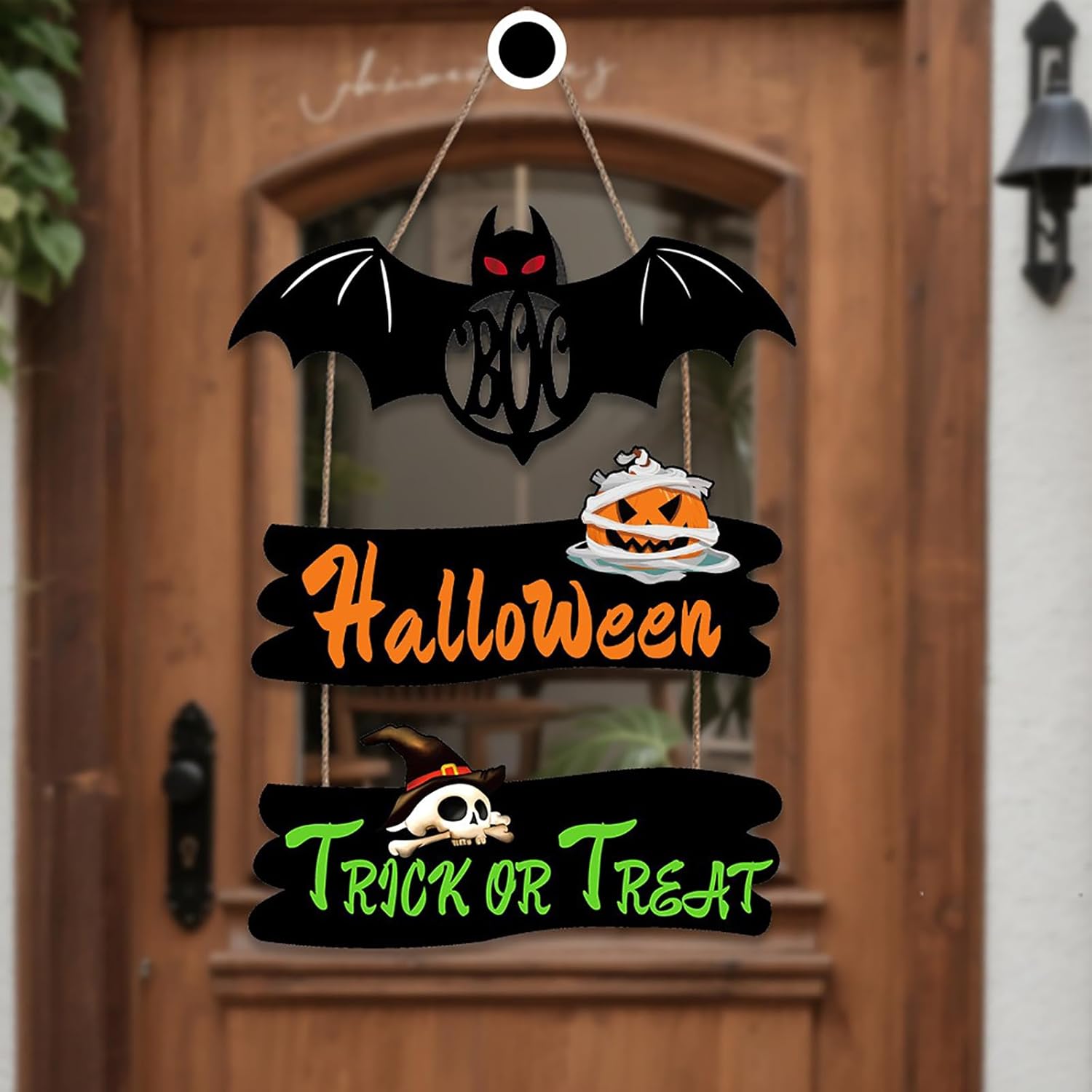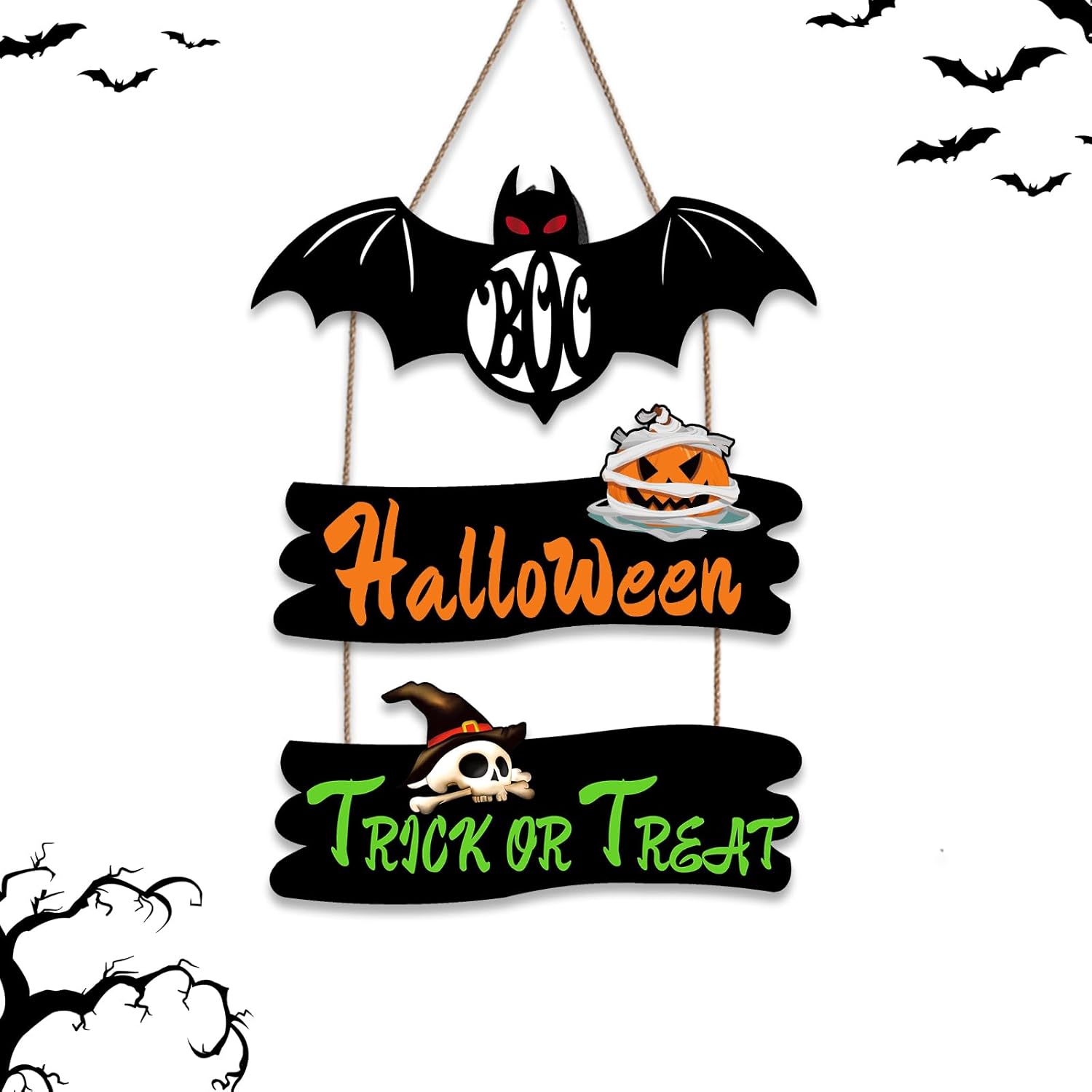 Halloween Door Hanging Sign Decoration 3 Pieces Wooden Plaques Wall Art with Bat Pumpkin Skull Pattern Trick or Treat Wooden Plaques for Yard Front Door Home Outdoor Hanger