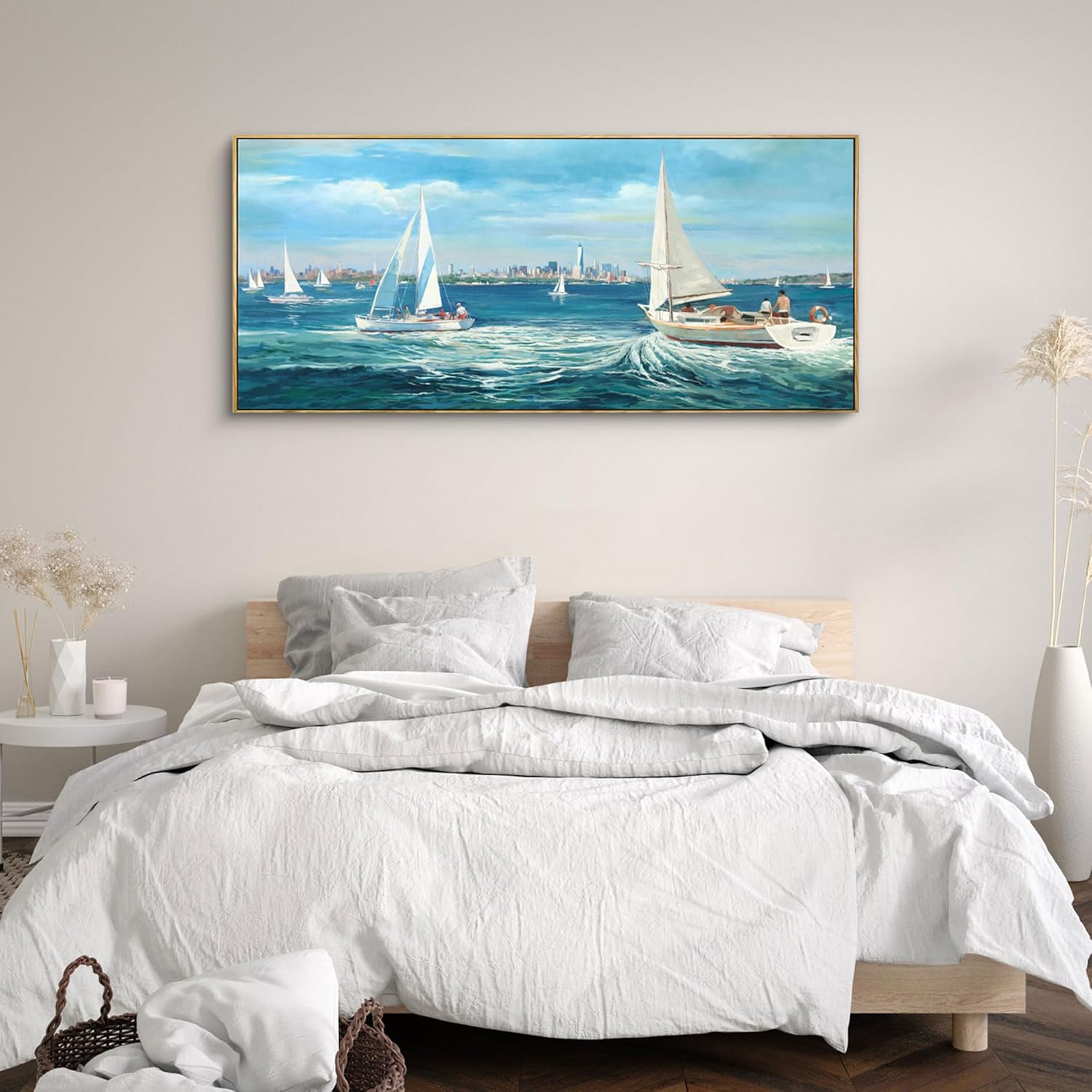 - Large Blue Canvas Wall Art Seascape Painting Landscape Picture Textured Navy Modern Sailboat Ocean Artwork Framed for Living Room Bedroom Bathroom Home Office Wall Decor Large Size 70"x31"