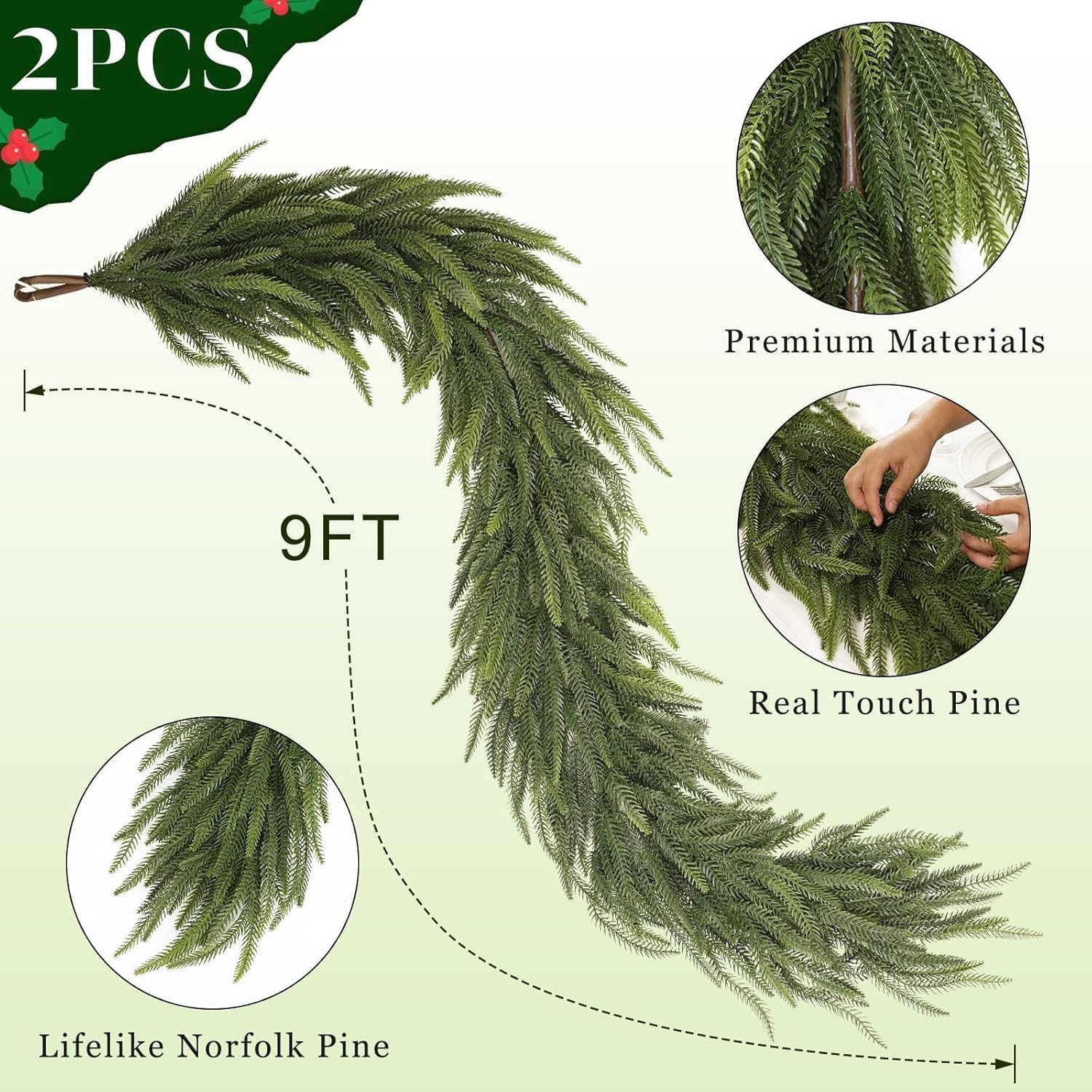 9FT Christmas Norfolk Pine Garland -2PCS, Artificial Pine Needles Garlands Faux Greenery Fake Garland for Holiday Fireplace,Table,Window,Stairs,Mante,Indoor Outdoor Decor
