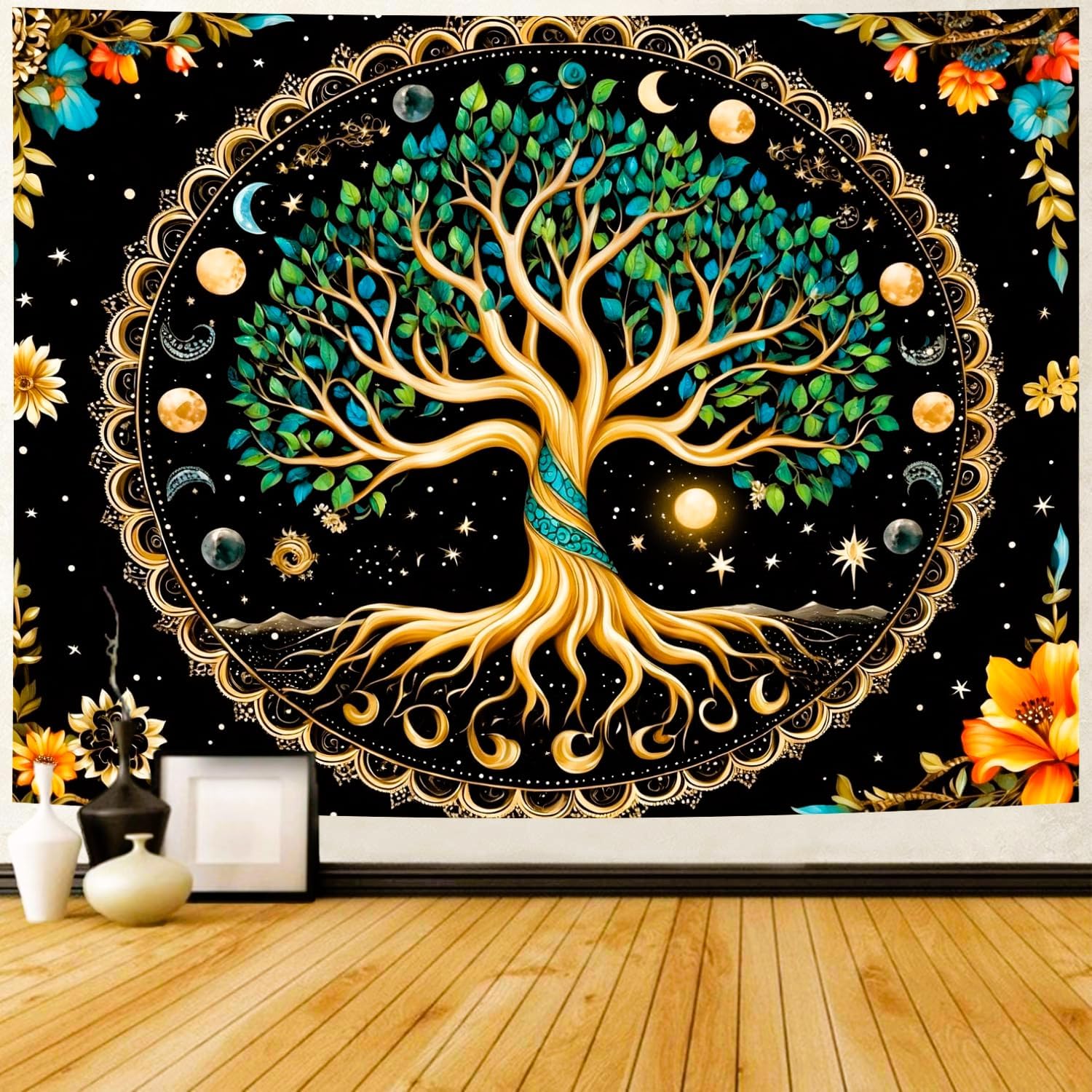 Delur Tree of Life Tapestry Moon Phase Nature Flower Plant Tapestry Wall Hanging Boho Mandala Spiritual Sun Aesthetic Psychedelic Headboard for Bedroom Living Room Home Decor (70.8" x 92.5")