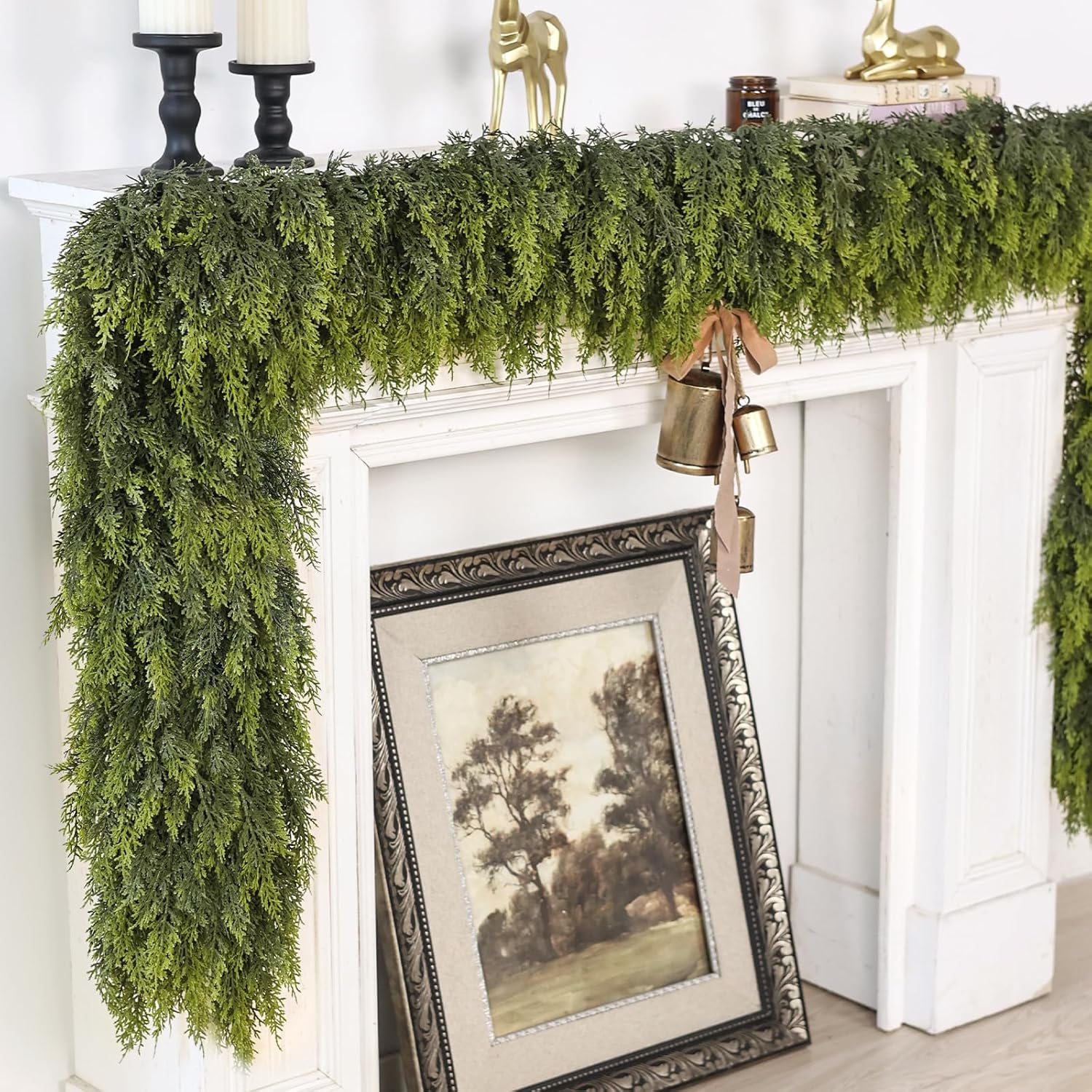 - [Quantity and Size]:The package includes 2 pieces of artificial cedar garland, approximately 9 feet in length, which is perfect for decorating fireplace.
