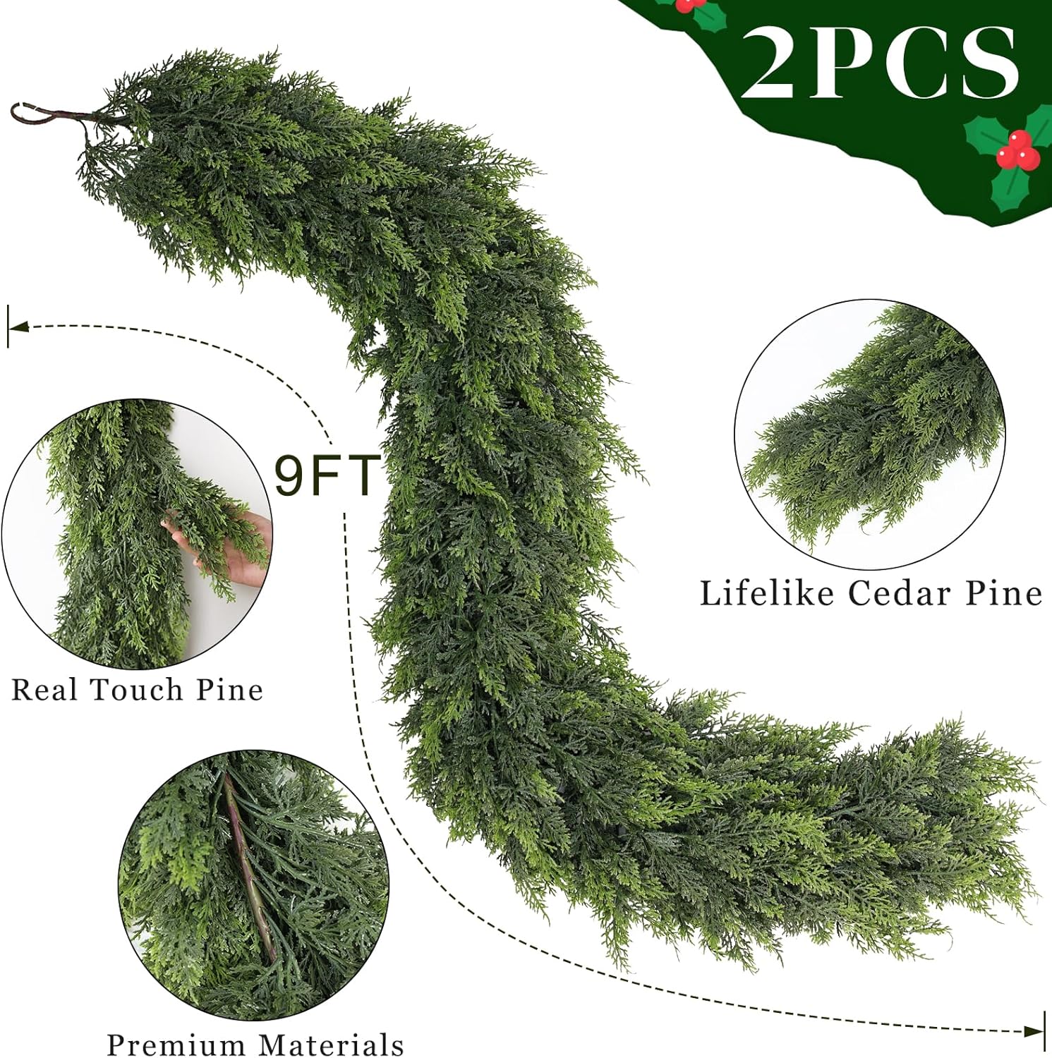 9FT Real Touch Cedar Garland - Artificial Christmas Garland Fake Green Faux Thick and Lush Pine Needles Garlands for Table Fireplace Mantle Holiday Home Indoor Outdoor Decor (2PCS)