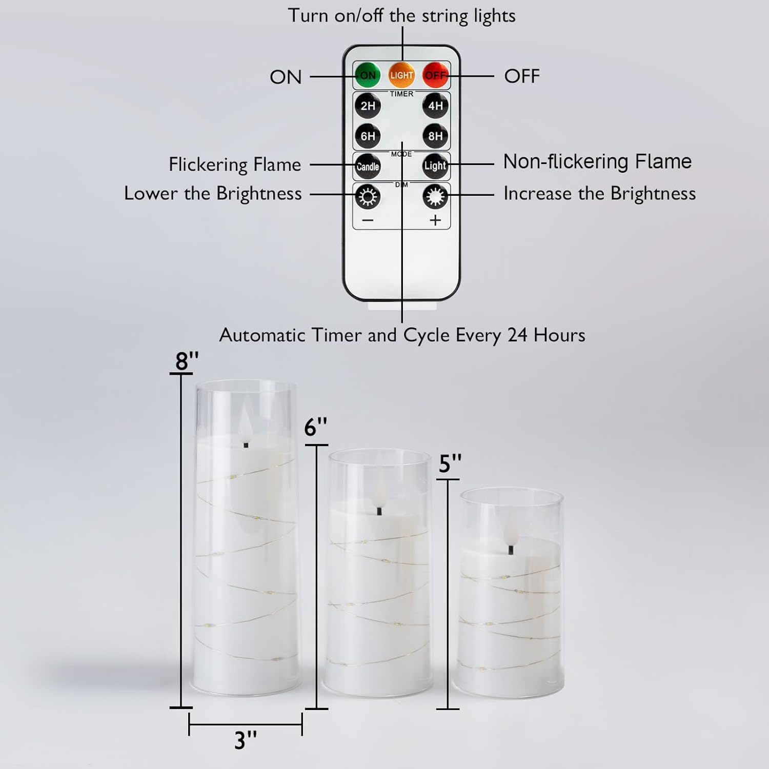 - Convenient Remote Options: Easily Turn ON/OFF, individually control the string light switch, and adjust the lighting mode and brightness. Set the 2H/4H/6H/8H timer then the remote candles will automatically work every day saving you time and battery energy.
