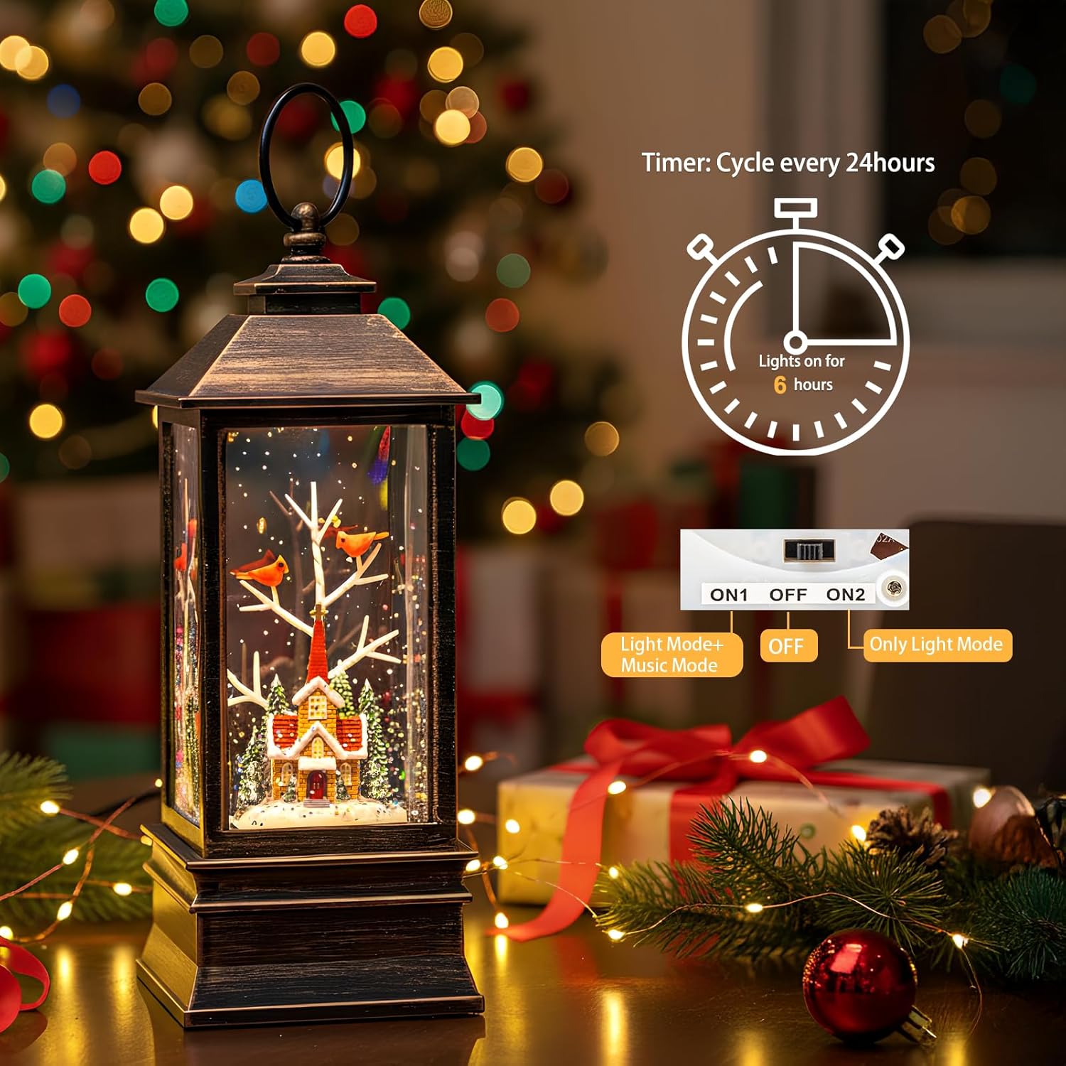 - 【Snow Globe Lantern】Lighted christmas village church scene, When turned on a warm LED shines on the figurine and swirling glitter to gives our Christmas globe a whimsical look for the Christmas Holiday season.