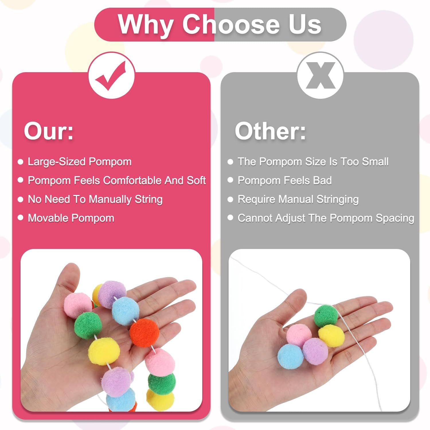 - Advantage: Made of durable polyester and cotton, the plush balls are soft and comfortable to touch, and the cotton thread is wear-resistant and not easy to break, durable, and can be reused for a long time. The spacing between the pom poms can be moved and adjusted, but will not slide at will, and the weight is light and easy to hang. It has a wide range of uses and can be used indoors and outdoors. Hang these pom pom decorative garlands where you want to decorate and add a festive atmosphere.