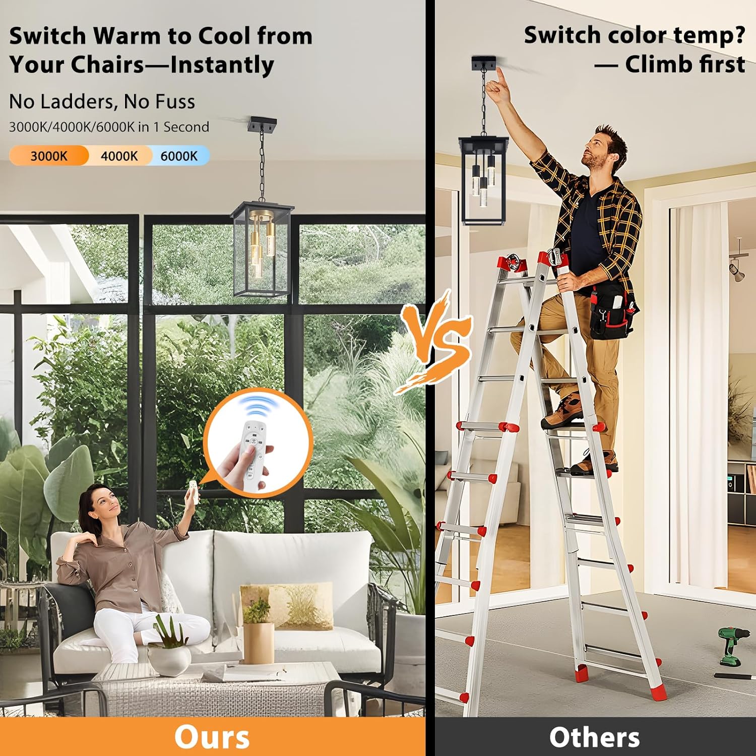 - Remote-Controlled, Dimmable Outdoor Pendant Light for Patio: No more manual tweaks on the light body—AIBISOD black gold outdoor pendant light for patio comes with a remote, letting you adjust color temp and brightness easily from the ground. Stepless dimming (0-100%) and one-touch half-bright mode save 50% energy, fitting gatherings or high patio/porch spots perfectly