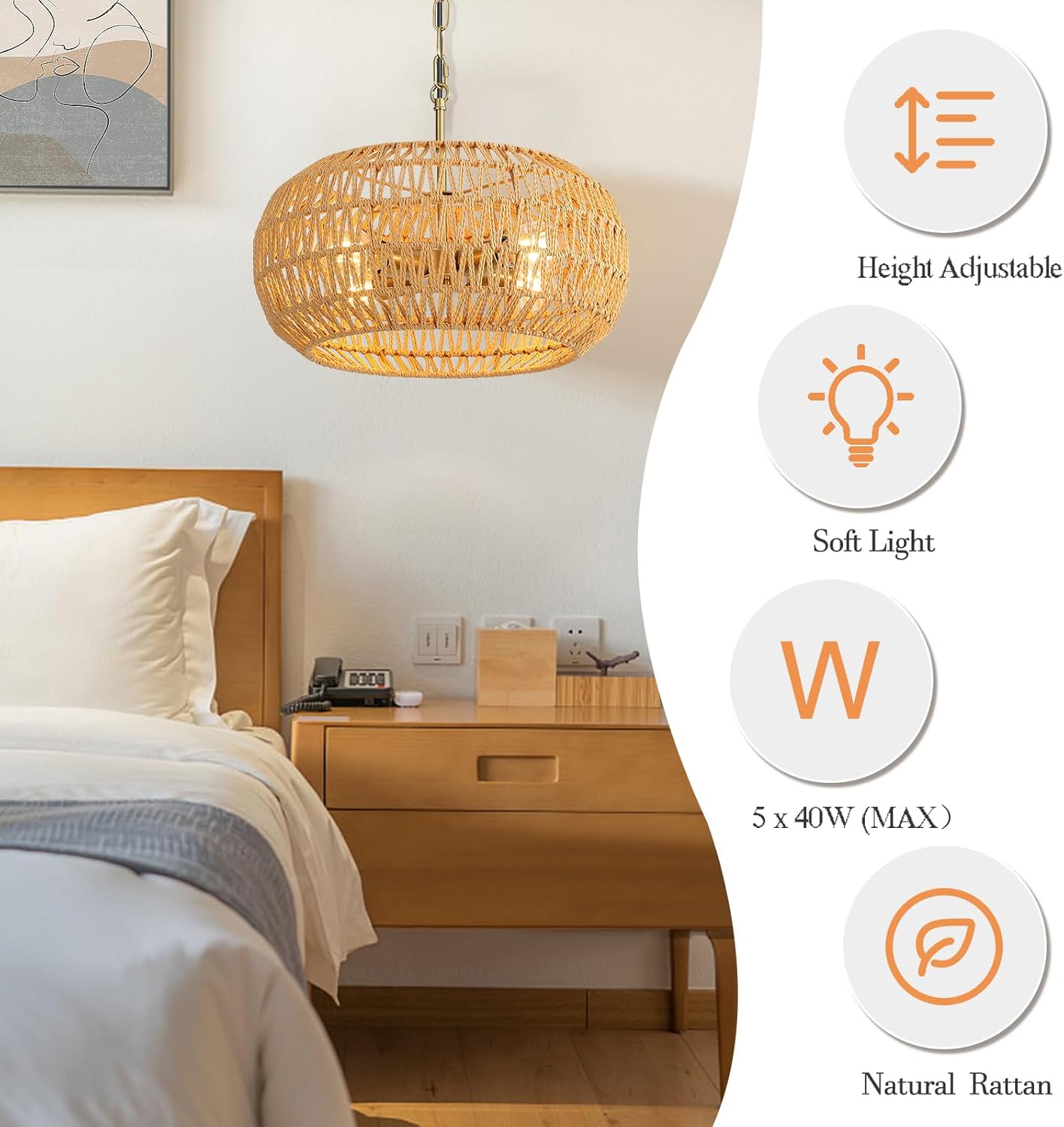- 【Durable Craftsmanship & Timeless Aesthetic】The durable wicker chandelier combines metal construction with woven rattan for lasting use Its timeless drum shape (17.3"" width × 8.6"" height) and earthy palette enhance any space without overwhelming low or high ceilings.