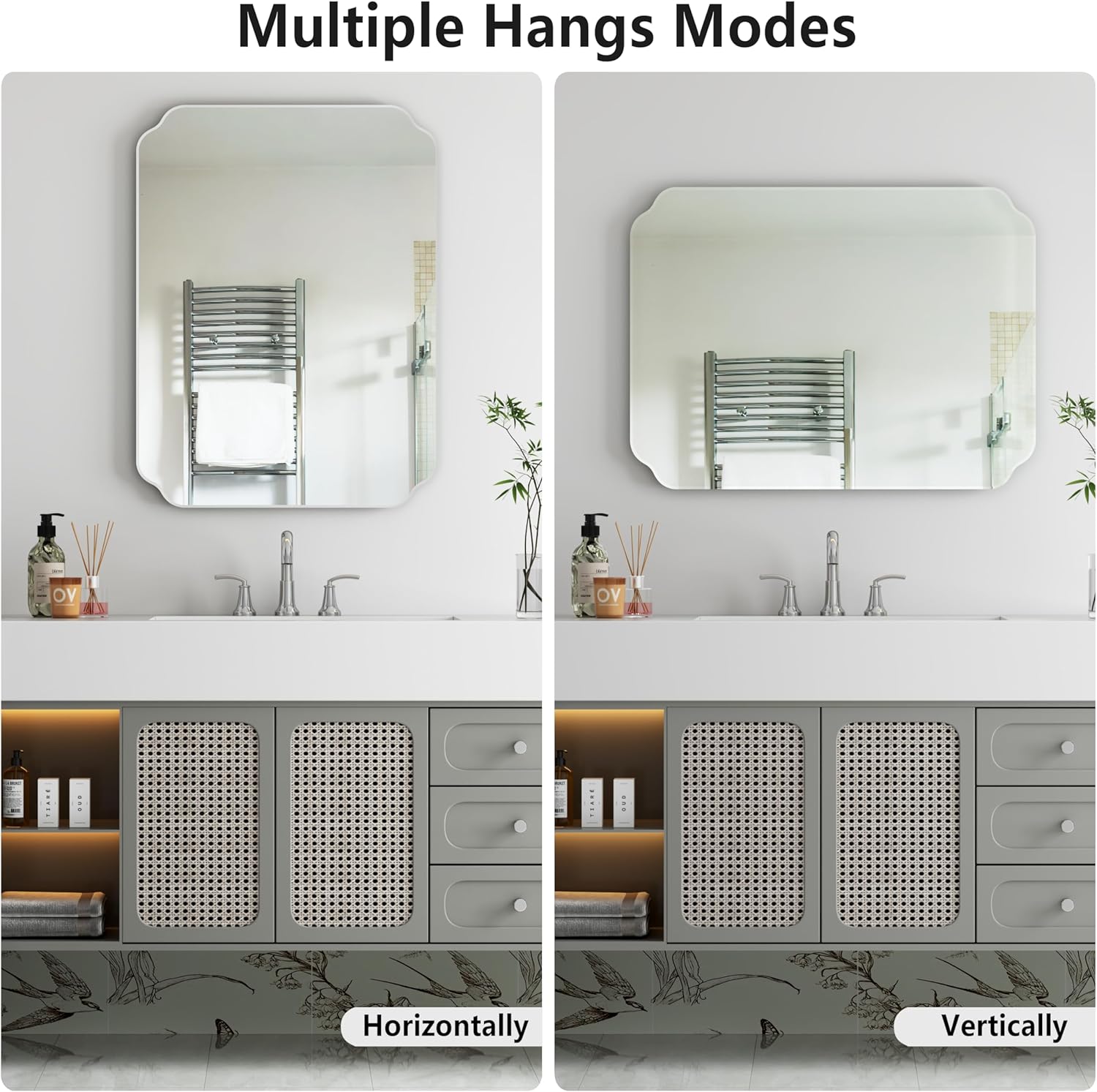- FLEXIBLE MULTI-SCENE APPLICATION - Designed for hassle-free horizontal or vertical wall mounting, the beveled mirror edge complements diverse spaces—bathrooms, hallways, bedrooms, and living rooms—to create personalized decor effortlessly.
