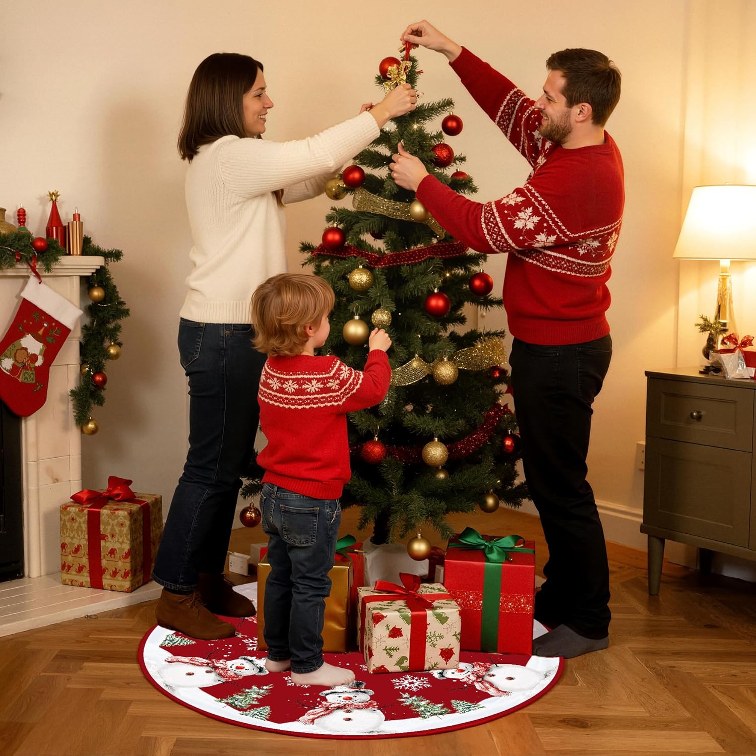 Christmas Tree Skirt 48 Inches Red Xmas Soft Cover Mat Decor Retro Xmas Tree Skirt for New Year Holiday Ornaments Indoor Outdoor Decorations (Snowman Pattern)