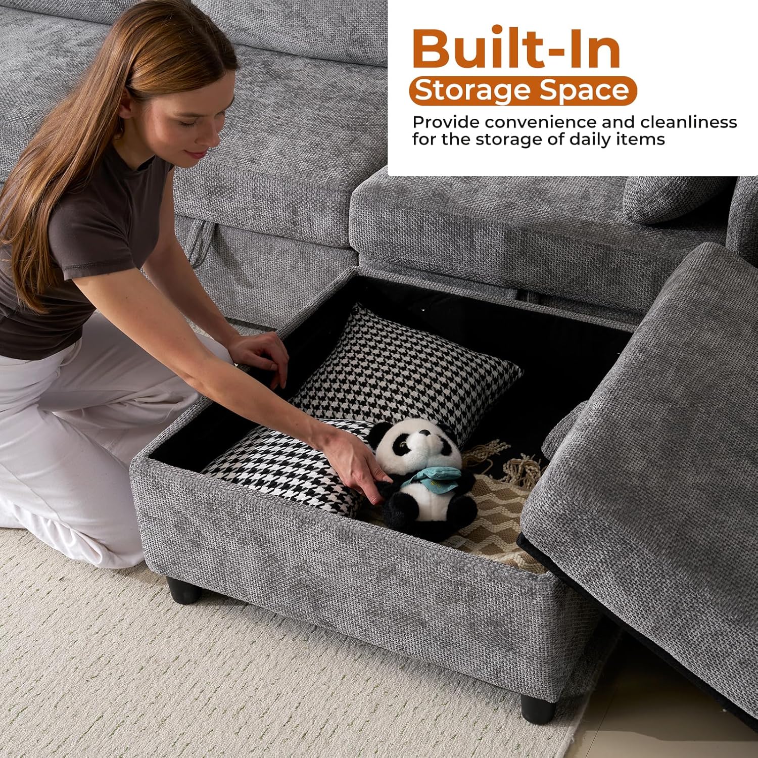 - Large storage space: Each seat of the modular couch is equipped with a spacious storage space, perfect for storing blankets, toys, pillows, and other items. This thoughtful design keeps your living space neat and tidy while maintaining a combination of comfort and functionality.