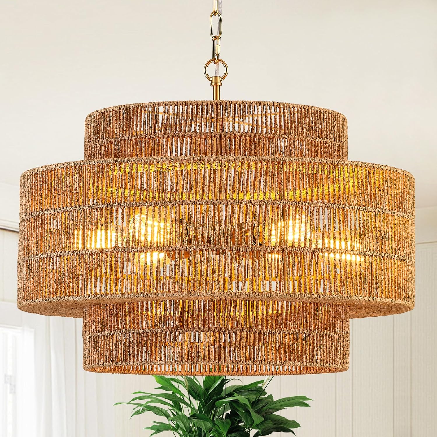 - 【3-Tire Design】The 3-tier rattan chandelier's simple wicker weave and golden finish metal frames bring a vintage bohemian style. This farmhouse chandelier light fixture features three round metal frames that form a captivating semicircular hollow cage. This design sets it apart, adding an element of sophistication.