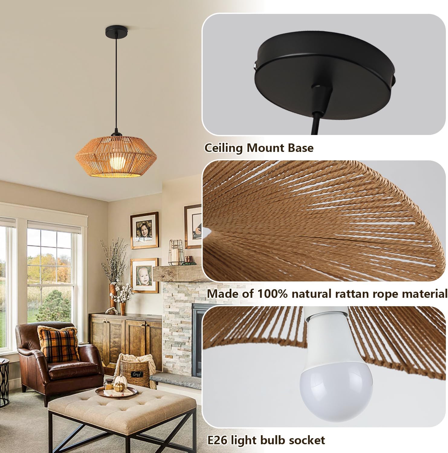 - 【Wide Application】This Hand-woven Hanging Lighting is made of delicate natural rattan rope material, high-quality wires and Natural solid wood base, hanging lights for bedroom,islands, dining rooms, kitchens, living rooms, hallways, cafes, bar, entryway, etc.